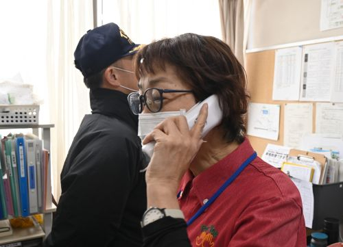 続いて通報訓練。119番に火事の様子を伝える練習です。消防署の方に、住所を伝えるときには「杉並区」から告げることが大事であることを教えていただきました。