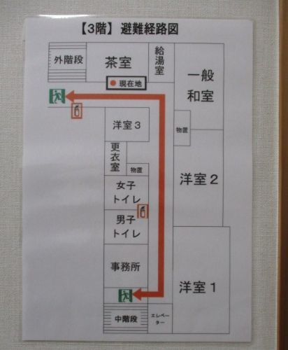 今回の実地訓練を通して、避難の手順を再確認することができました。もし、火災が起こった時は職員が誘導いたしますが、利用者の方々も落ち着いて避難指示に従っていただけると幸いです。ゆうゆう高円寺北館の館内には、消火器の位置が書かれた避難経路図を掲示しています。いざという時のために、今一度確認しておきましょう。