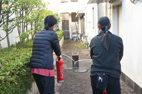 まずは、消火器を使用した消火訓練。大きな声で「火事だ!」と叫んでから、消火器を操作。火元に近づいてからノズルと黄色いピンを取ってレバーを引きます。