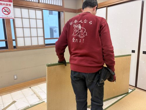 畳の交換作業は3月13日(金)の夕方、閉館してから行われました。その時の様子を少しだけご紹介。