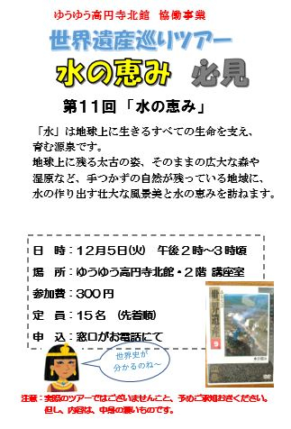 2023.11.10 お知らせ 第10回世界遺産巡り「教会建築」が終了しました Tweet シェアする 次回の世界遺産巡りは、「水の恵み」12月5日(火)当館2階 講座室において午後2:00~となります。 ただ今申込み受付中です。 詳細はポスターをご覧ください。 一覧へ戻る