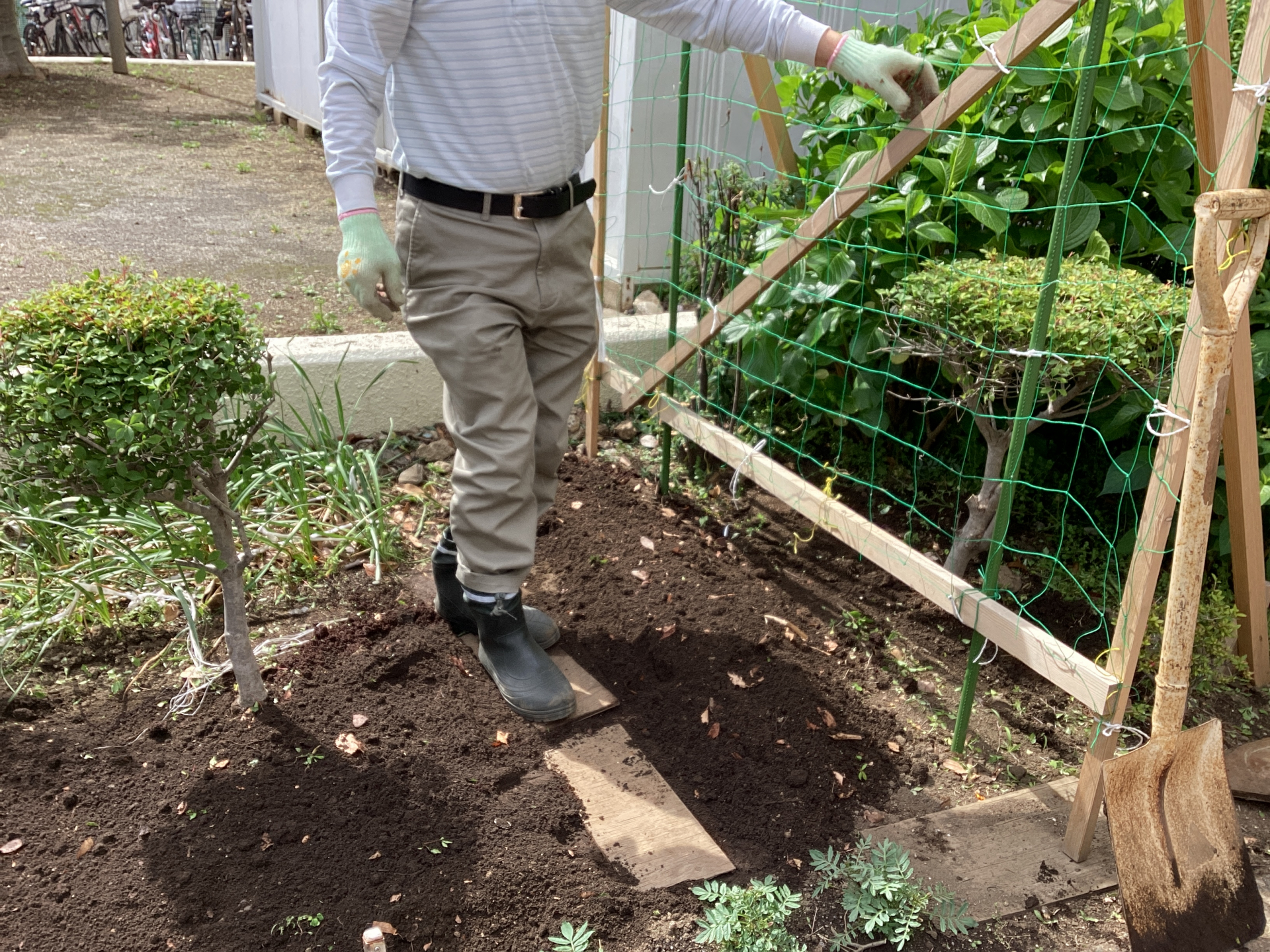 足場を作って、しっかりと耕した土を慣らしていました。