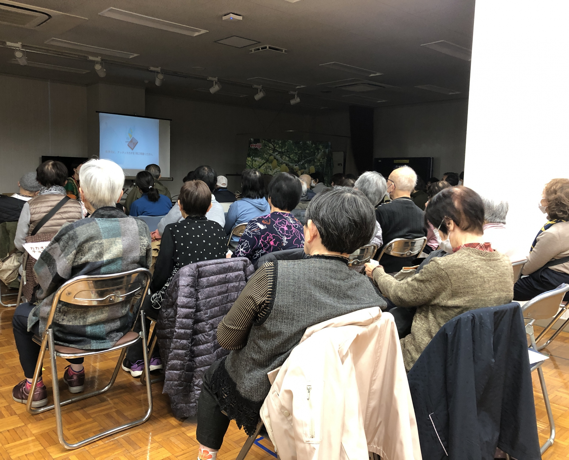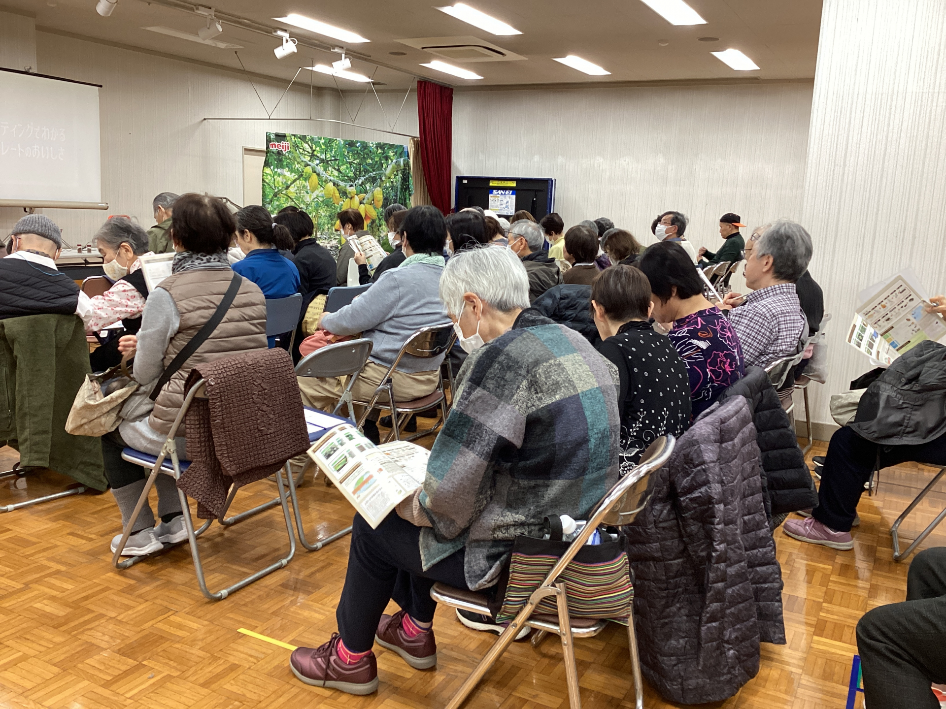 当日は沢山の方々に参加していただき、チョコレートがどのようにつくられるのか、カカオ豆についてのお話や、チョコレートの歴史等々…。資料と映像を見ながらご説明いただきました。