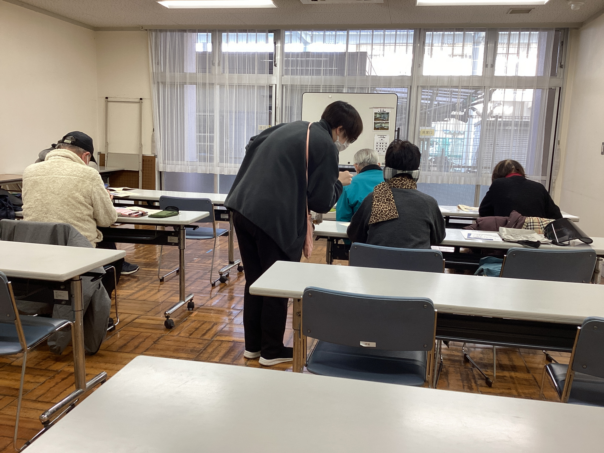写真の送り方やスタンプの送り方、keepメモの使い方等々、LINEの使い方の基本を職員手作りの資料を見ながら一緒に学んでいきます。