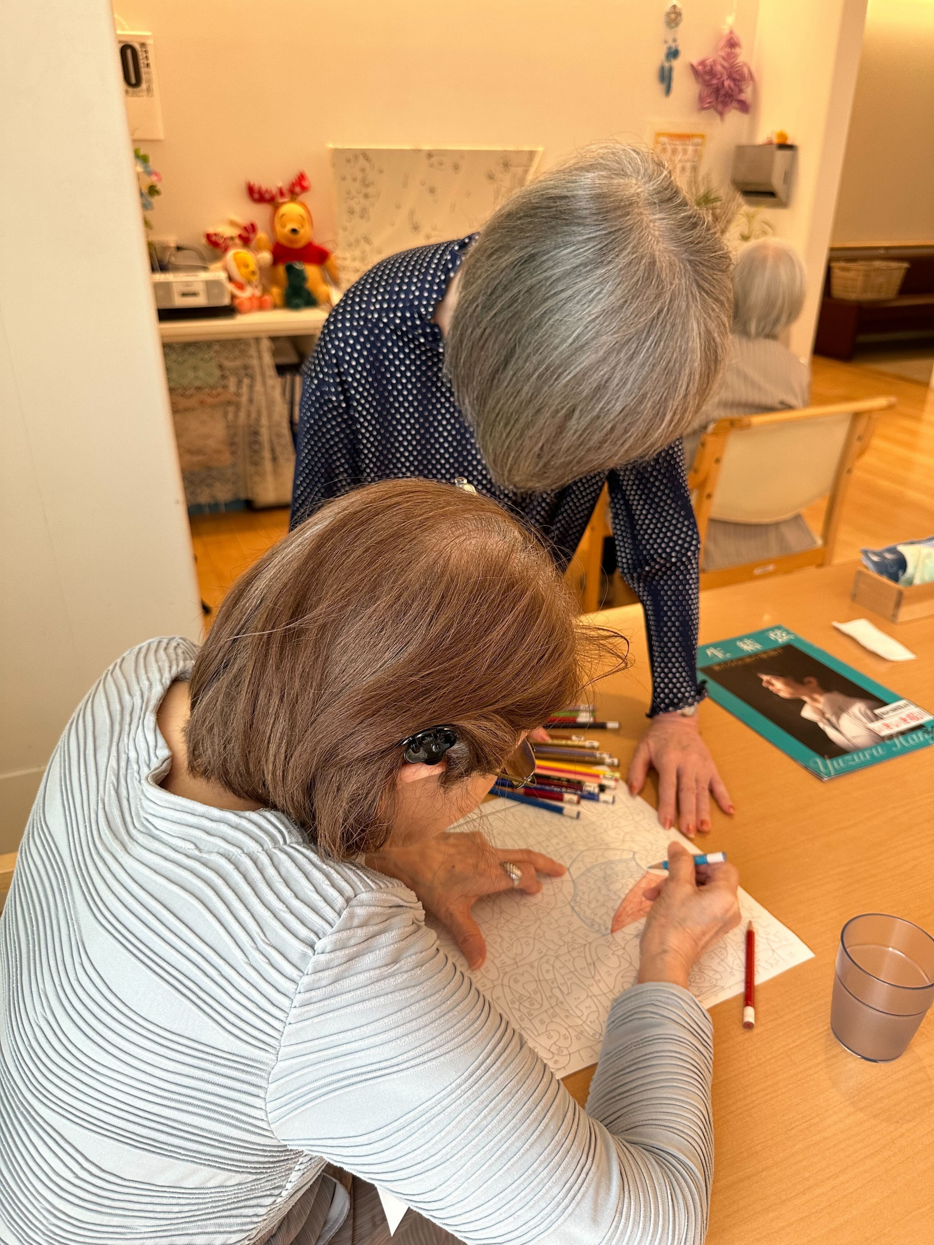 今日はO様、塗り絵のやり方を教えてあげてます。