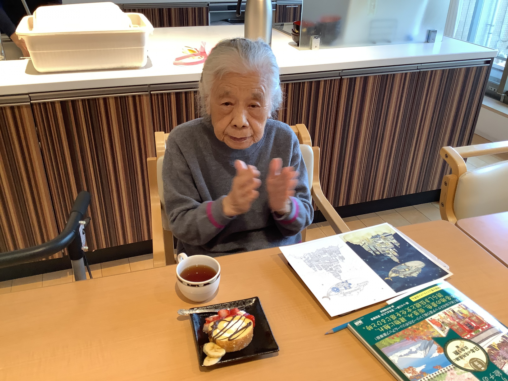 3階では今月お誕生日を迎える方が2名。という事で、職員の手作りデコレーションケーキでお祝いです。