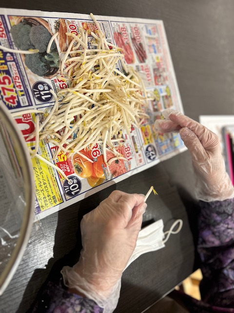 先日、夕食作りのお手伝いをお願いしました。もやしの芽取りです。 中々細かい作業でした、皆様器用にされており、あっという間に終ってしまいました。
