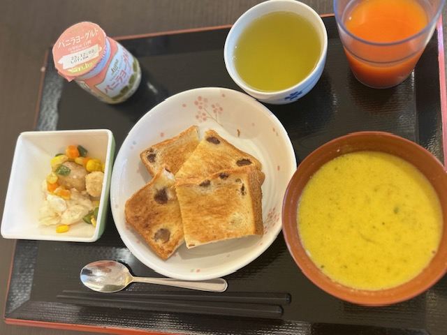 最近の朝食メニューはこちら(*^-^*)メインはかぼちゃのポタージュスープです。美味しそうなレーズン入りの食パンがあったので購入してみました♪
