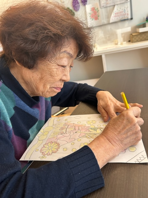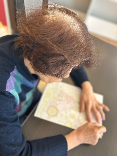 集中する時間…それぞれ個性が出ますね。こちらのご利用者様は、最近塗り絵をすると大変集中され、最初と比べて、段々と使う色の種類が豊富になり、そういった発見があると、とても嬉しいです。