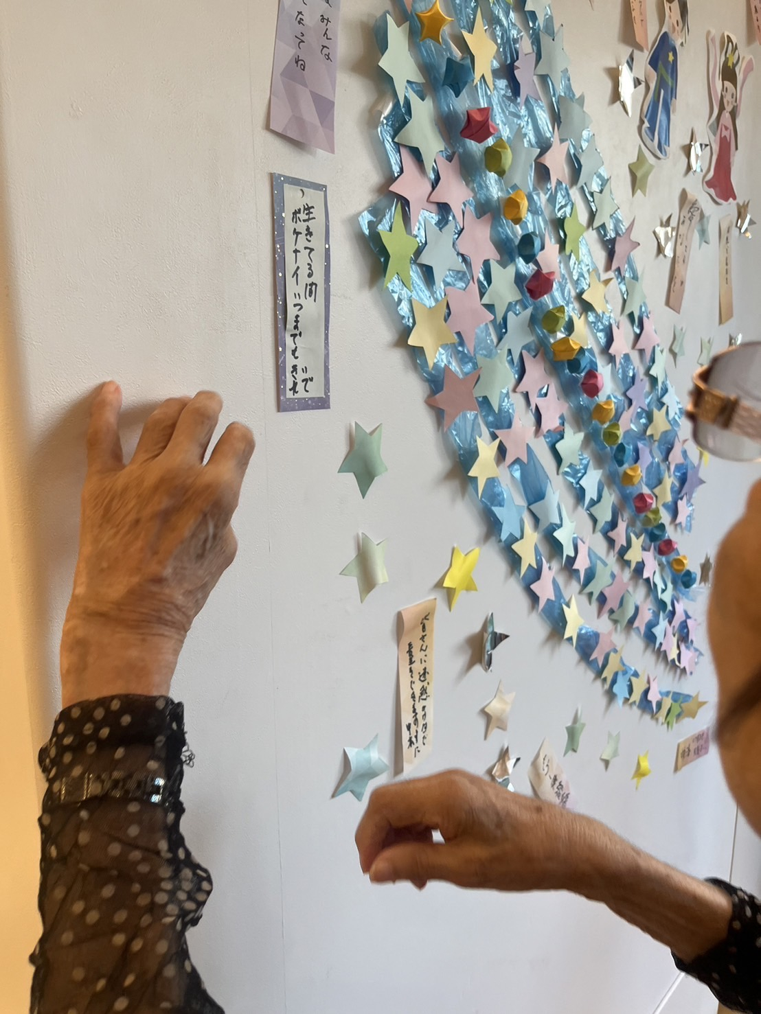 2024.07.07 活動報告(IN) 七夕飾り Tweet シェアする 皆様、こんばんは。 いつもご覧いただきありがとうございます。 もうすぐ七夕、ということで中央湊でもご利用者様と職員さんで素敵な飾り付けの完成です。 甲斐さんの願い気になりますね(笑) 皆様の願い事叶いますように♪ 脇島 #デイサービス #奉優会 #介護 #レクリエーション #七夕 #願い事 前の記事 2024.07.12 活動報告(IN) 夕食の準備 次の記事 2024.07.07 活動報告(IN) お手伝いありがとうございます。 一覧へ戻る