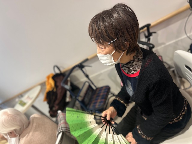 先日、ボランティアの方が来られ、扇子を使ったしっとりとした踊りや、アップテンポの曲に合わせた踊りをしました。
