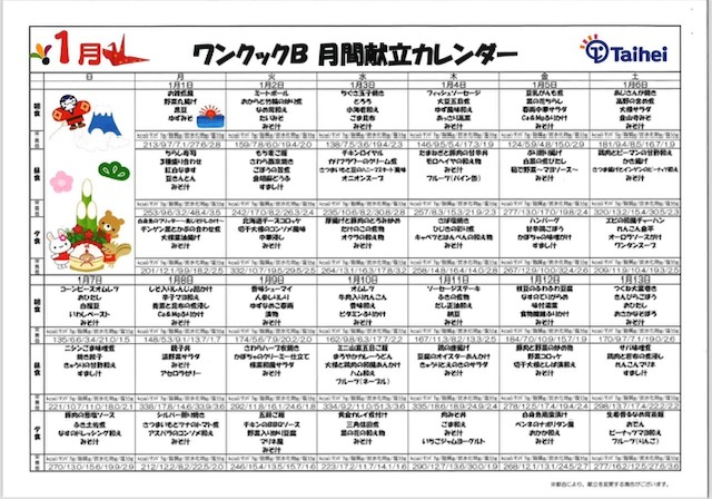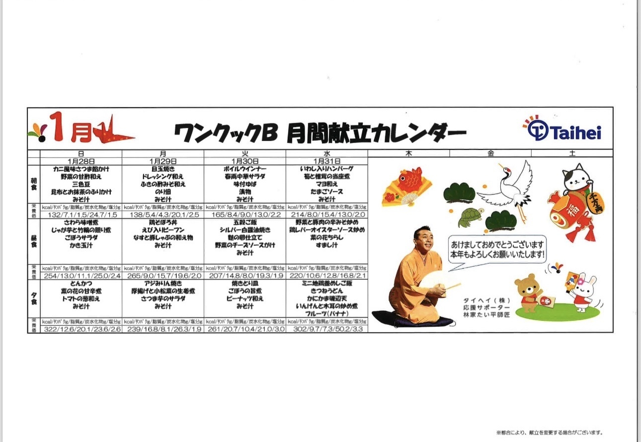 1月の食事カレンダーお待たせいたしました(*^-^*)