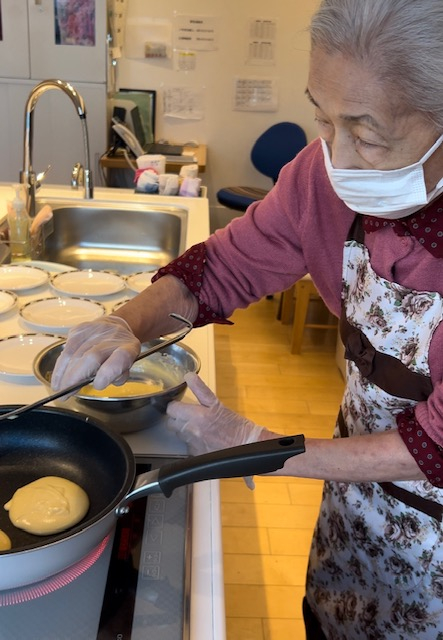 おやつを何か作ってほしいとリクエストをいただき、ご利用者様と一緒にパンケーキを作りました(*^-^*)