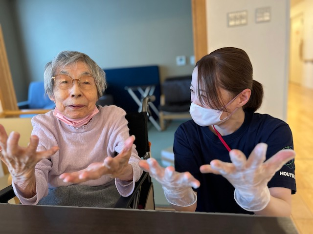 天気の良い日は外に散歩に行ったり、塗り絵や紙芝居、歌レクなど利用者様の体調を考慮しながらレクリエーション活動も幅広く行っております。