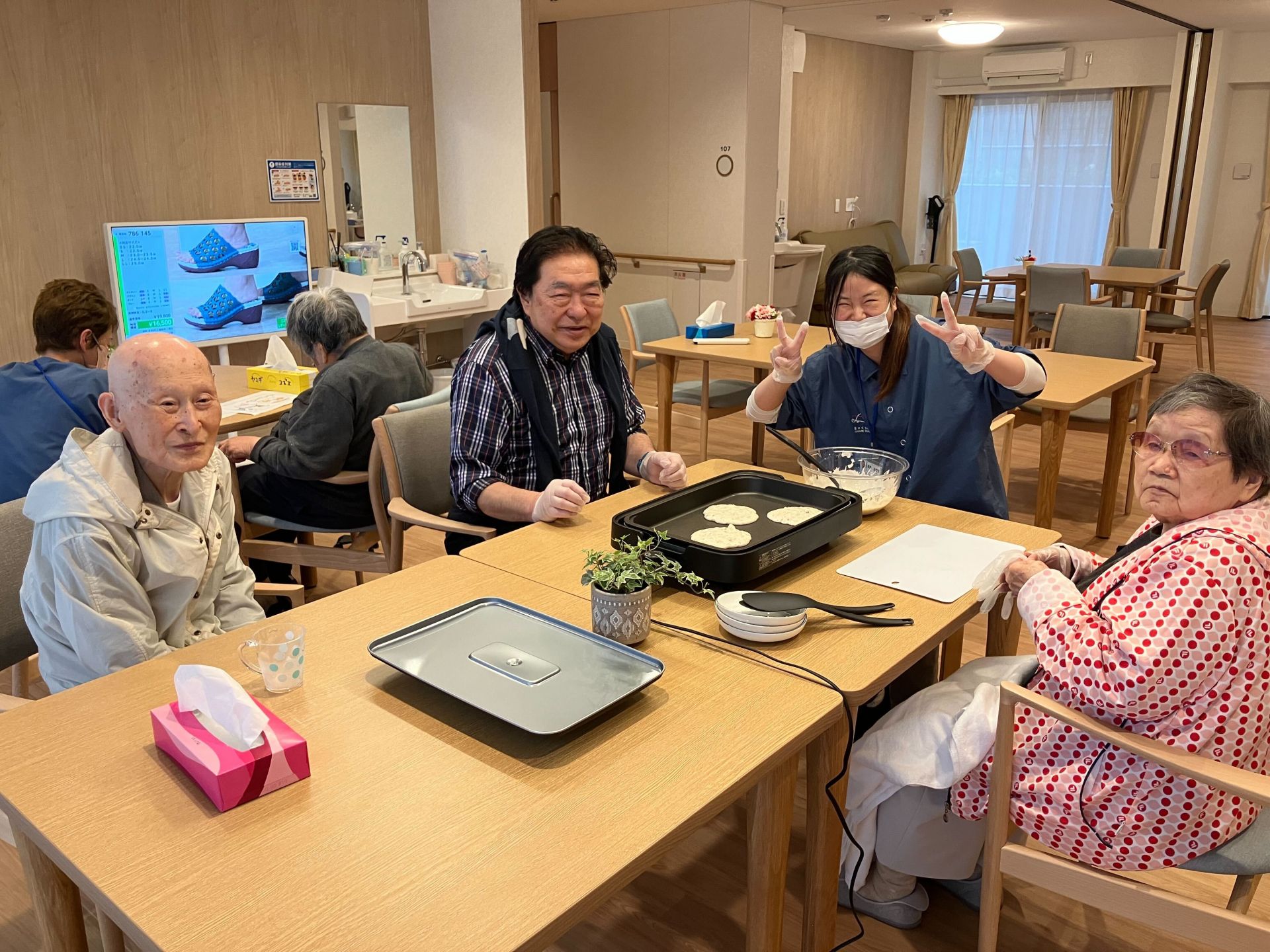 この日は施設でご利用者さんと一緒にホットケーキをつくりました!皆様協力して作っていただき、おいしそうに召し上がられていました。一緒にこうやって作業ができることがとても楽しいです!