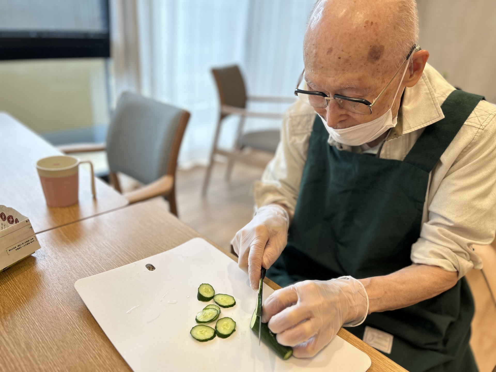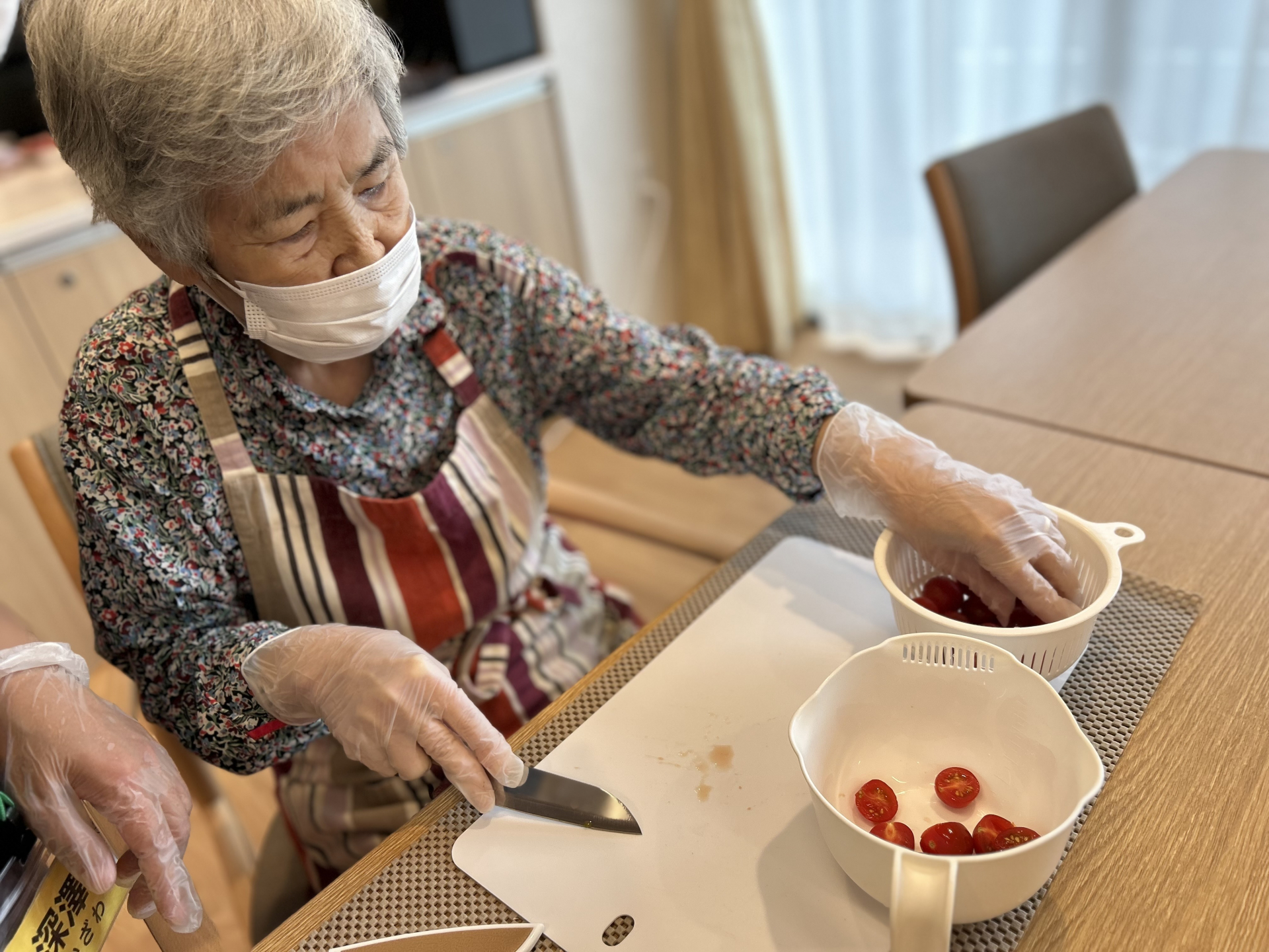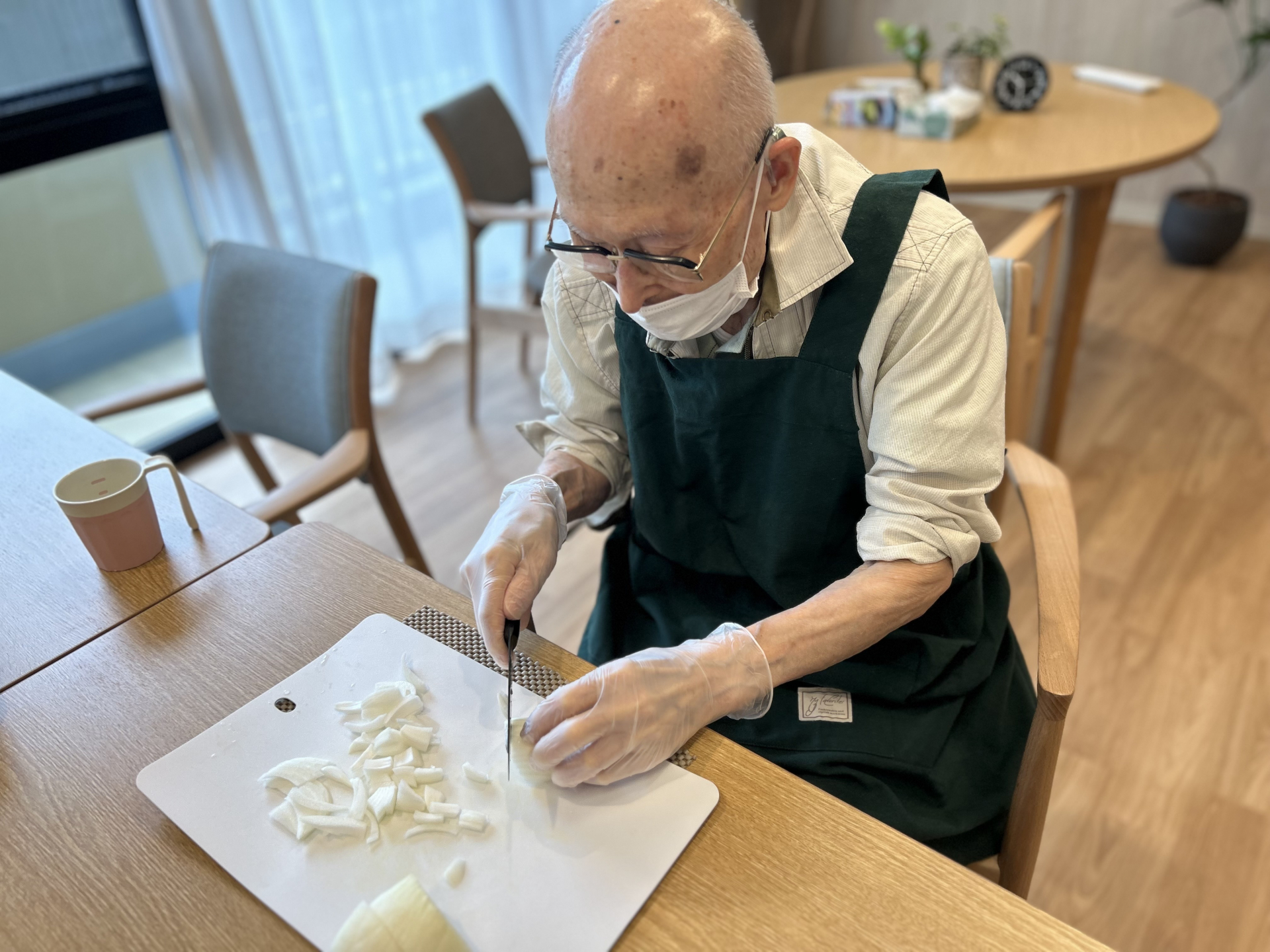 まずは、たまねぎのスライスからスタート。利用者様はさすがの手さばきで、手際よく切ってくださいました。