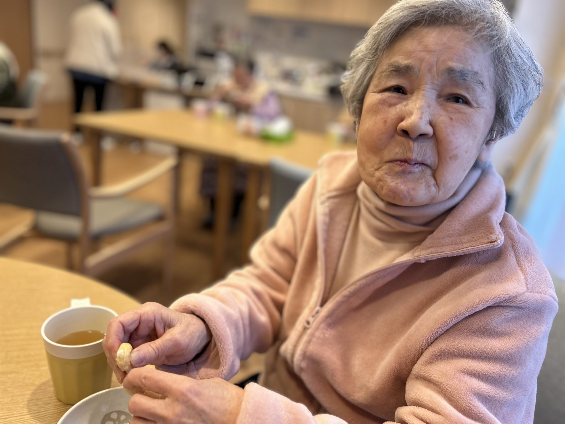 「こうやるといいかな?」「次はどうするの?」と、利用者さま同士で声を掛け合いながら進める様子も見られ、作る時間そのものが、わくわく楽しいひとときに。出来上がったポンデリングを前に、「自分で作ると美味しいね」「楽しかったね」と笑顔があふれ、心も体も動く、充実したおやつ時間となりました。
