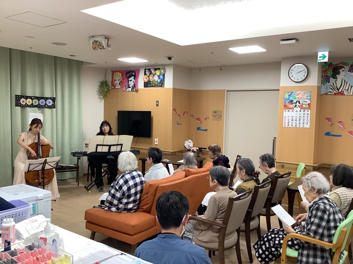 お客様の中で娘様がチェロの演奏者という方がいて、ご厚意で看多機で演奏して頂けることになったのでした。