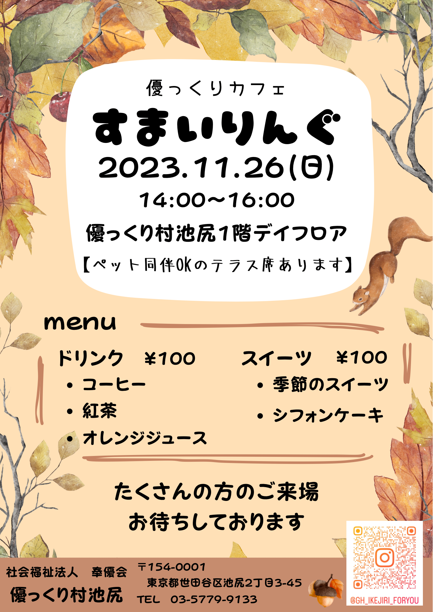 職員お手製の季節のスイーツと温かいドリンクも準備していますので是非お越しください!