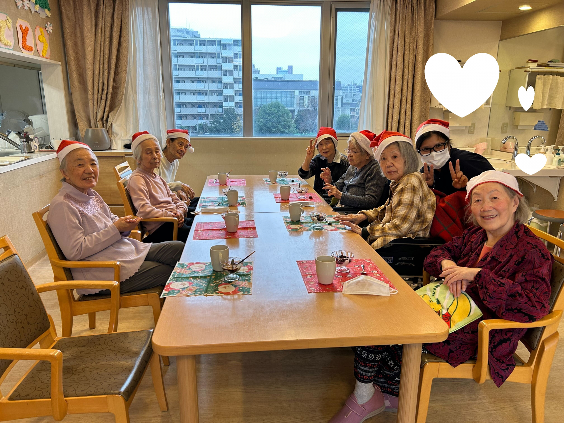 サンタさんの帽子を被って皆さんで写真取りました、その後おやつもいただきました。