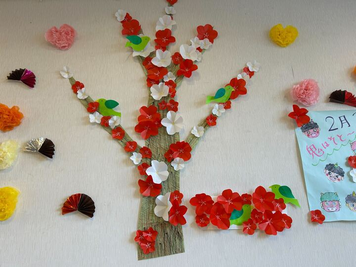 【グループホーム世田谷】池尻3F 2月の壁飾り~梅と鶯~