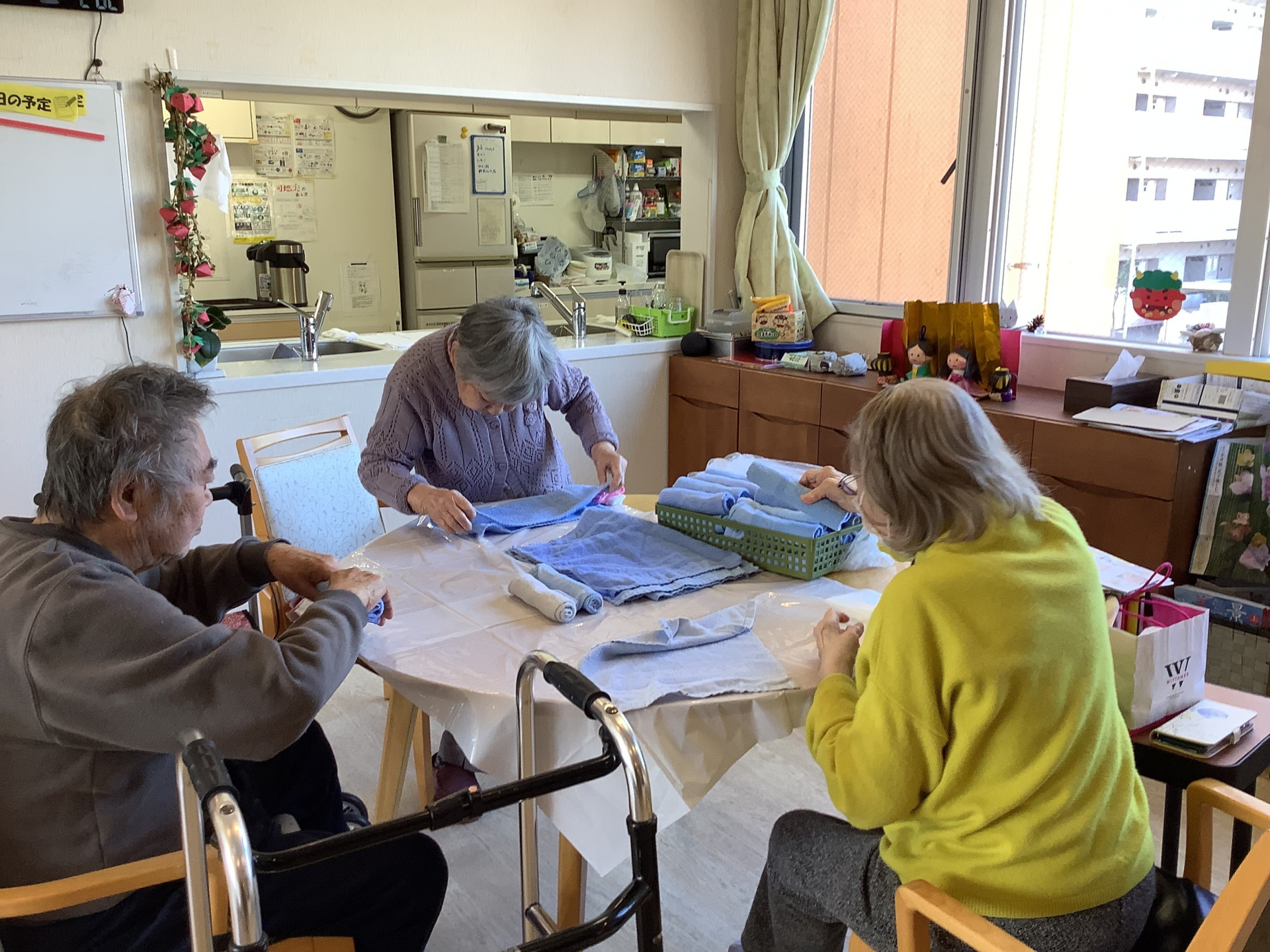 タオルたたみ・ビニールを三角△にたたんでもらったりしました。