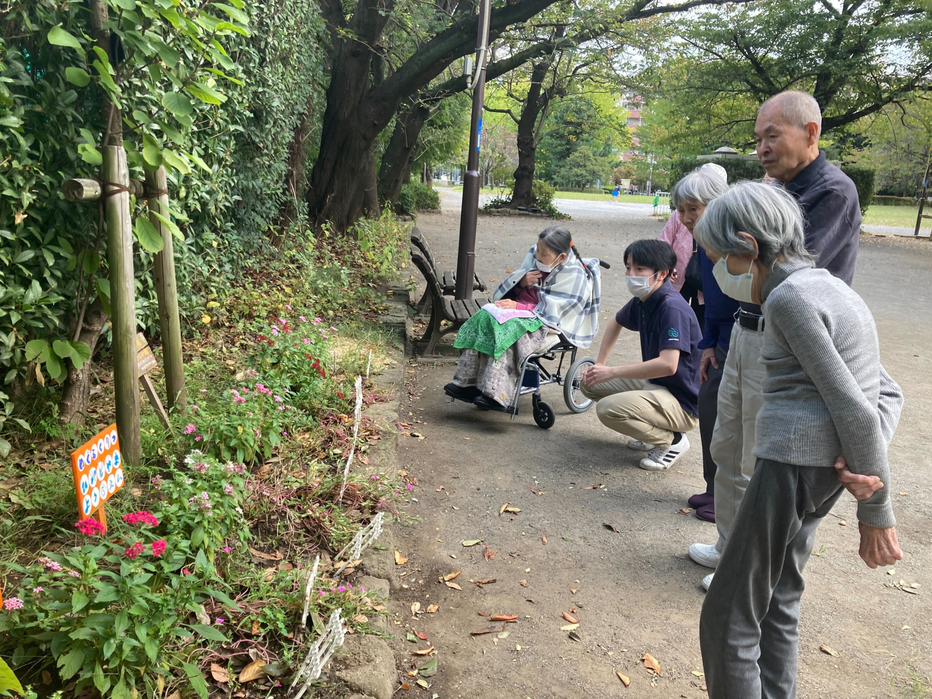 先日の天気の良い日にご利用様5名をお連れして大勢で近くの東山公園までお散歩に出かけました!!