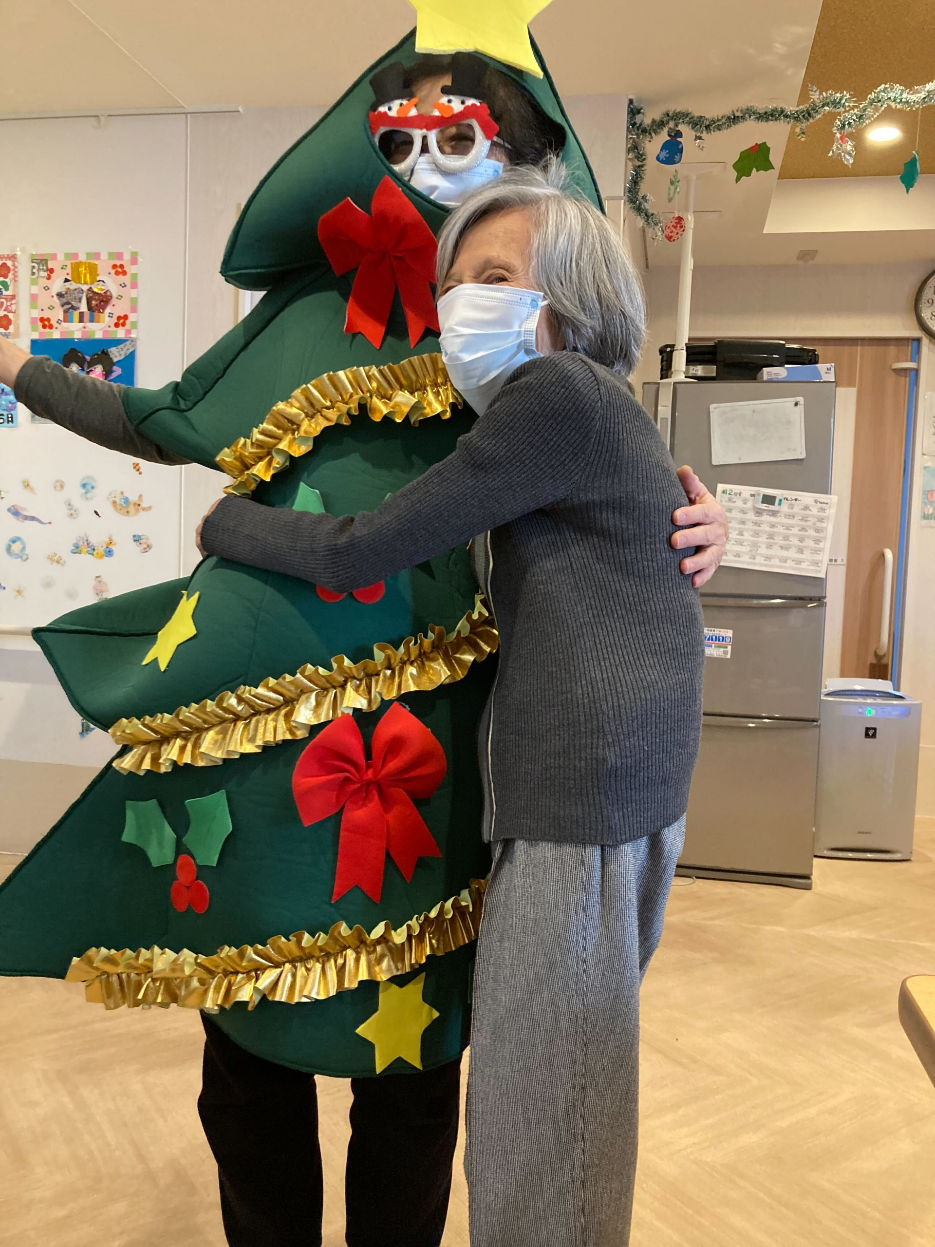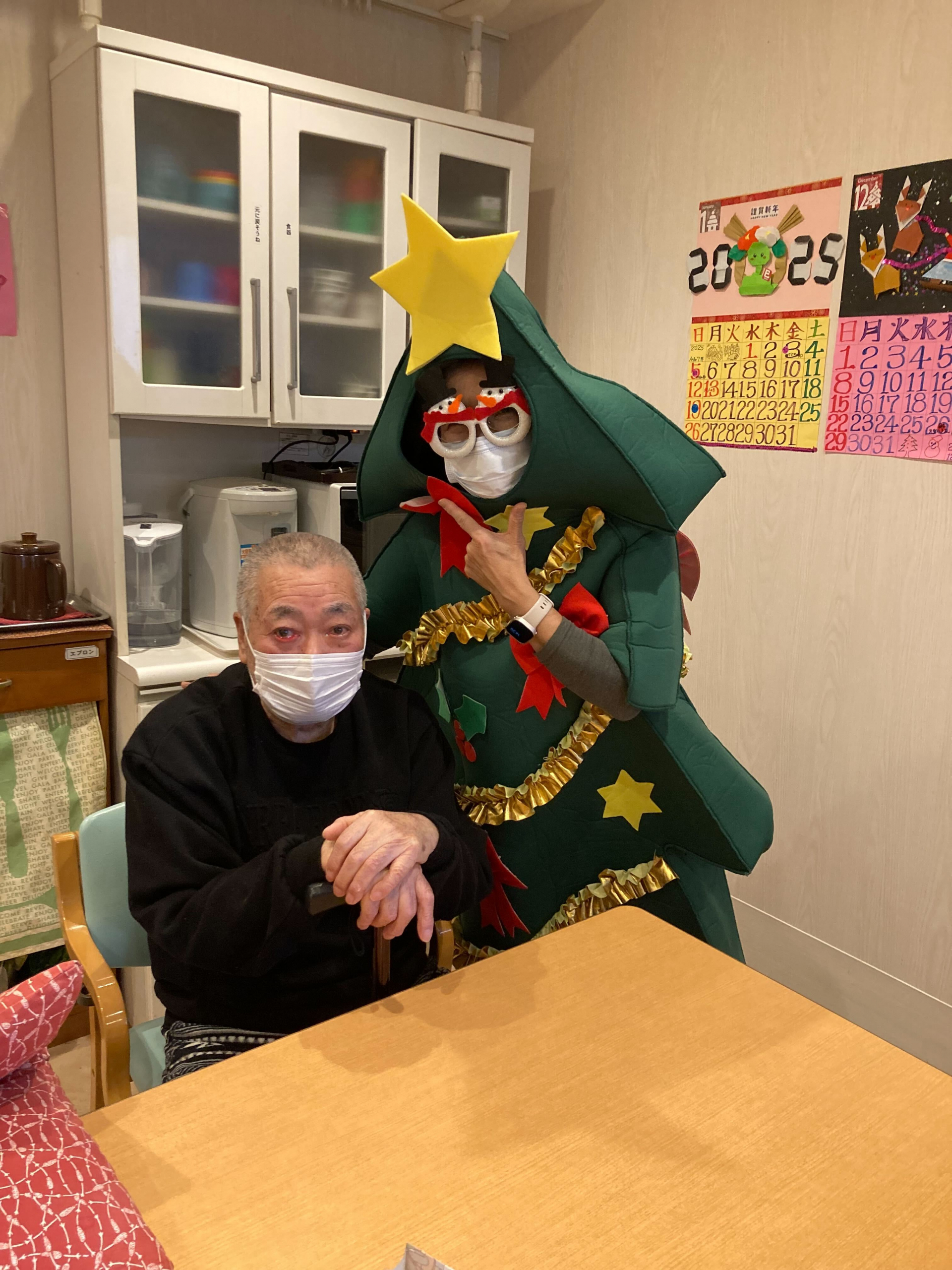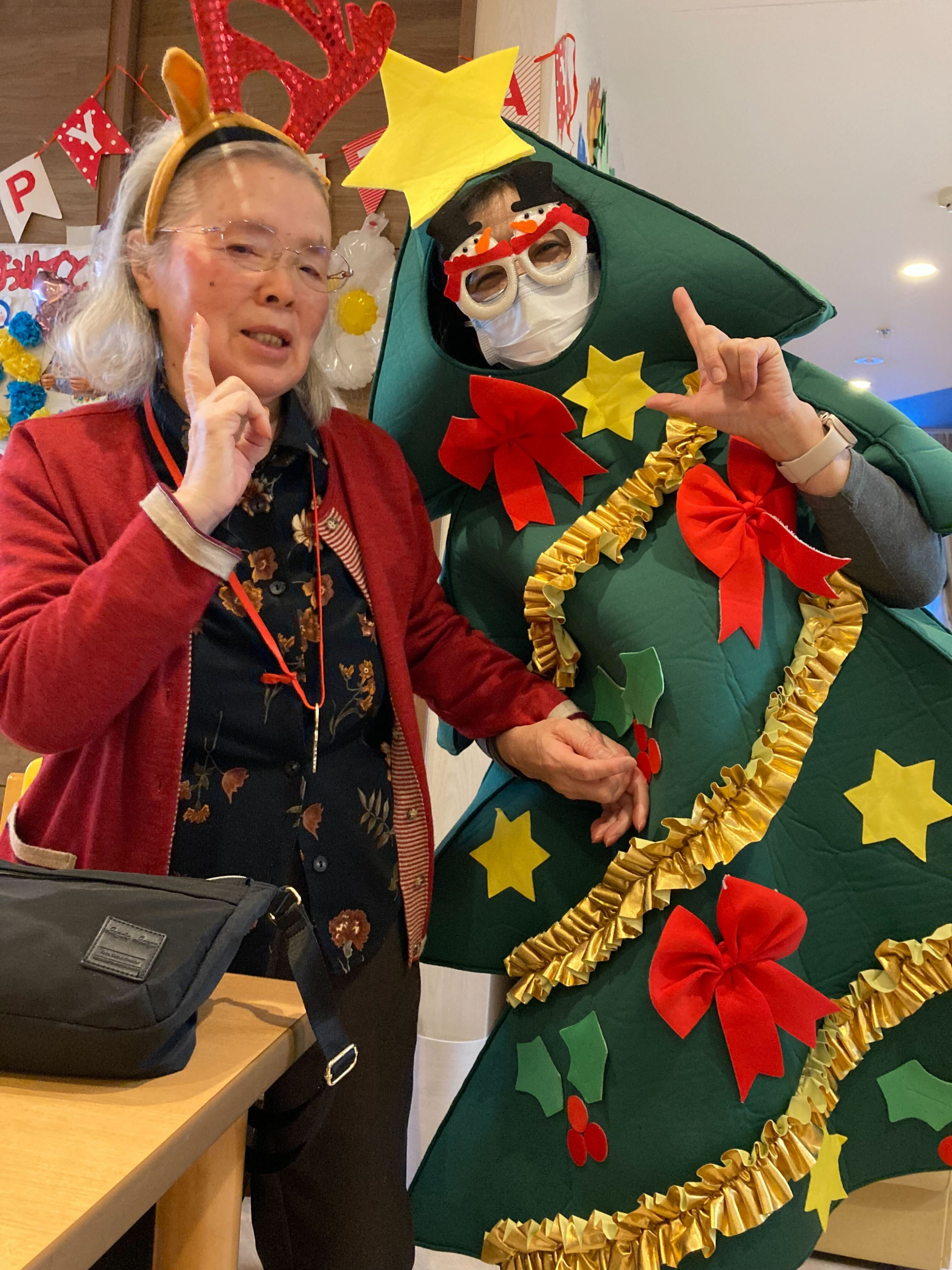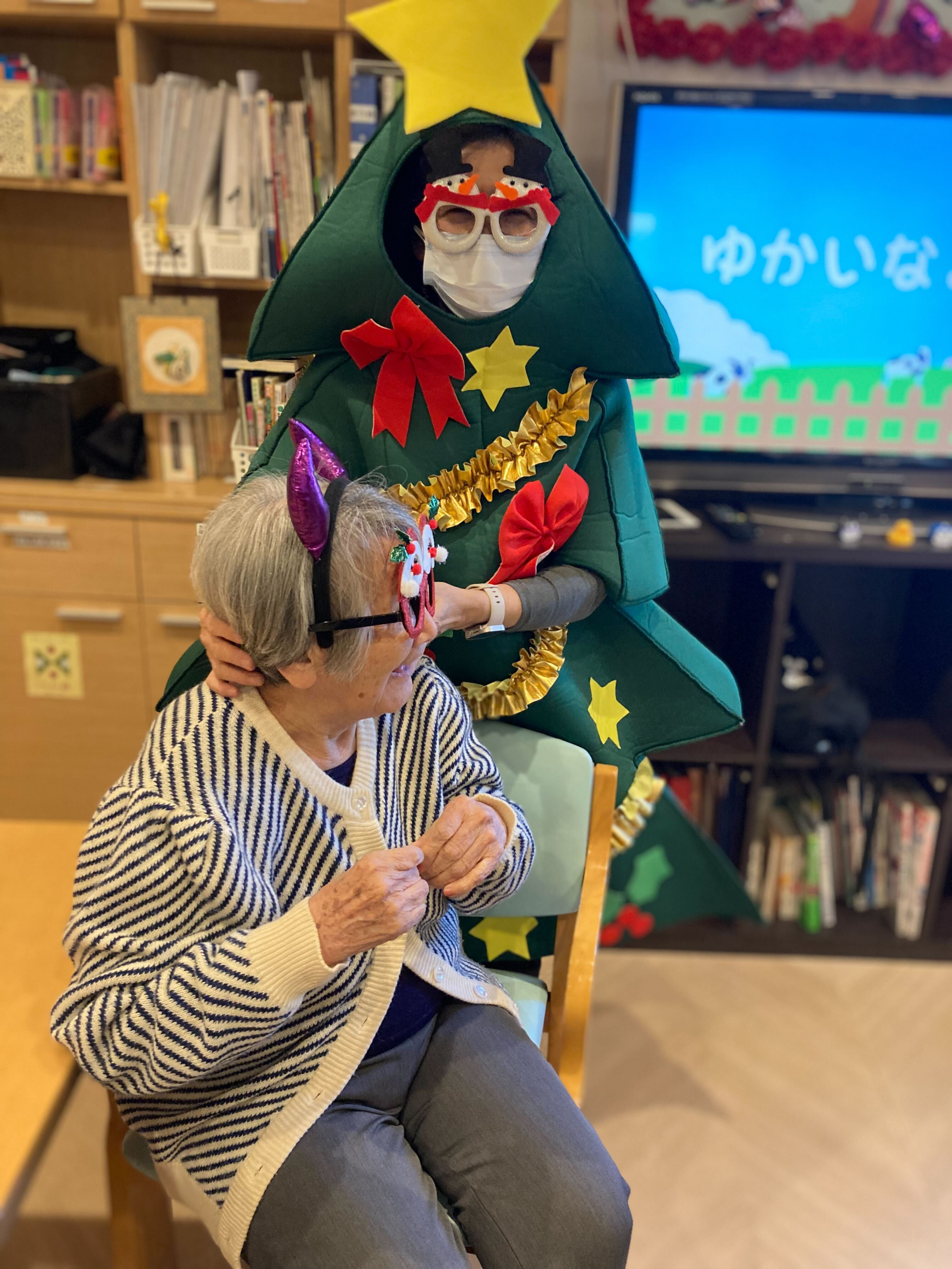 優っくり村池尻クリスマス会ではなんとクリスマスツリーをまとった職員が登場しました!