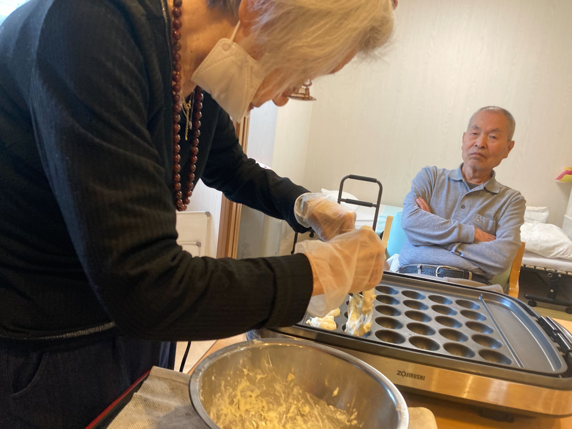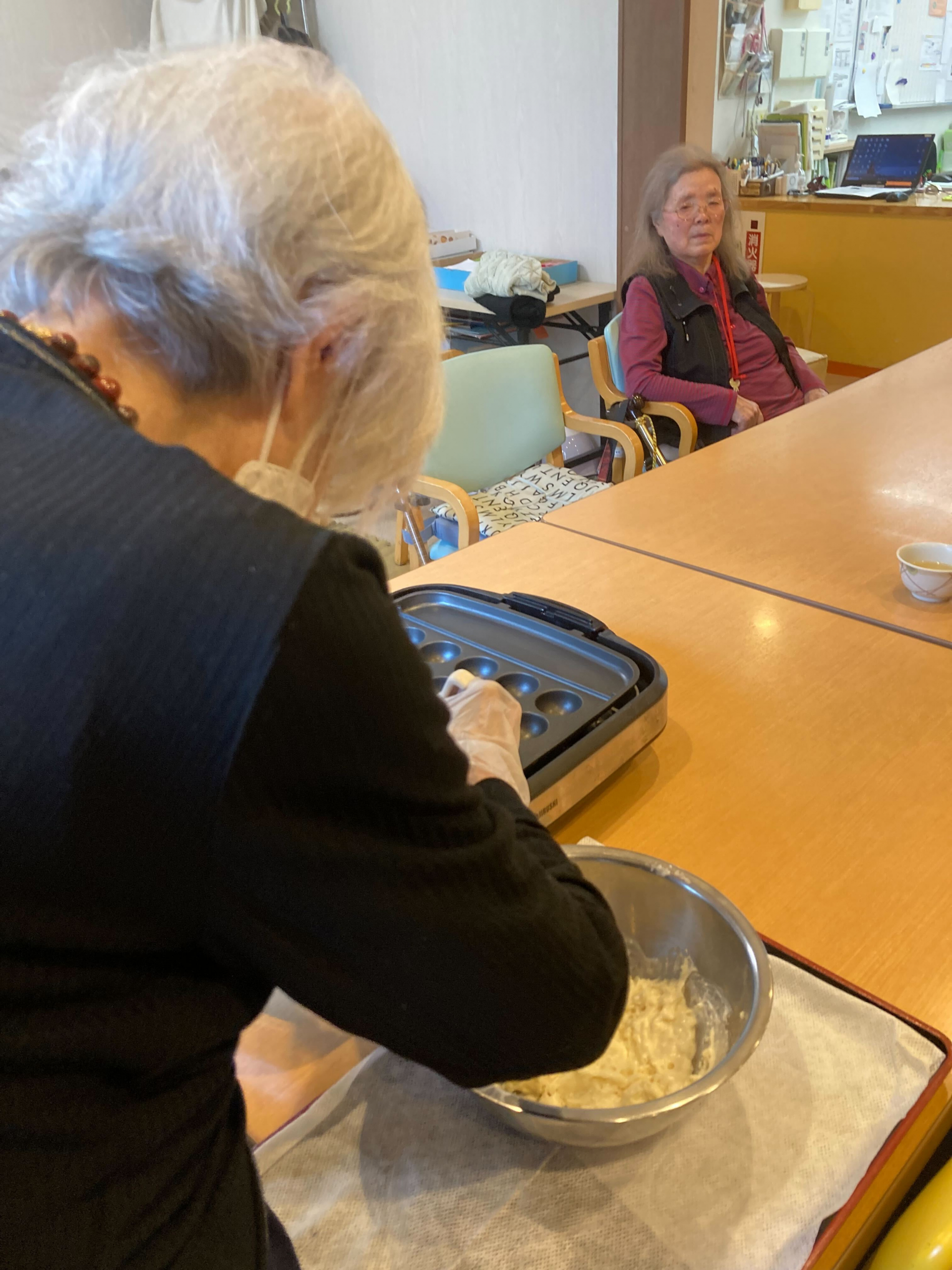 生地を作ったりたこ焼き器に流し込んだりを職員見守りの中ご利用者様主体で作りました!(^^)!