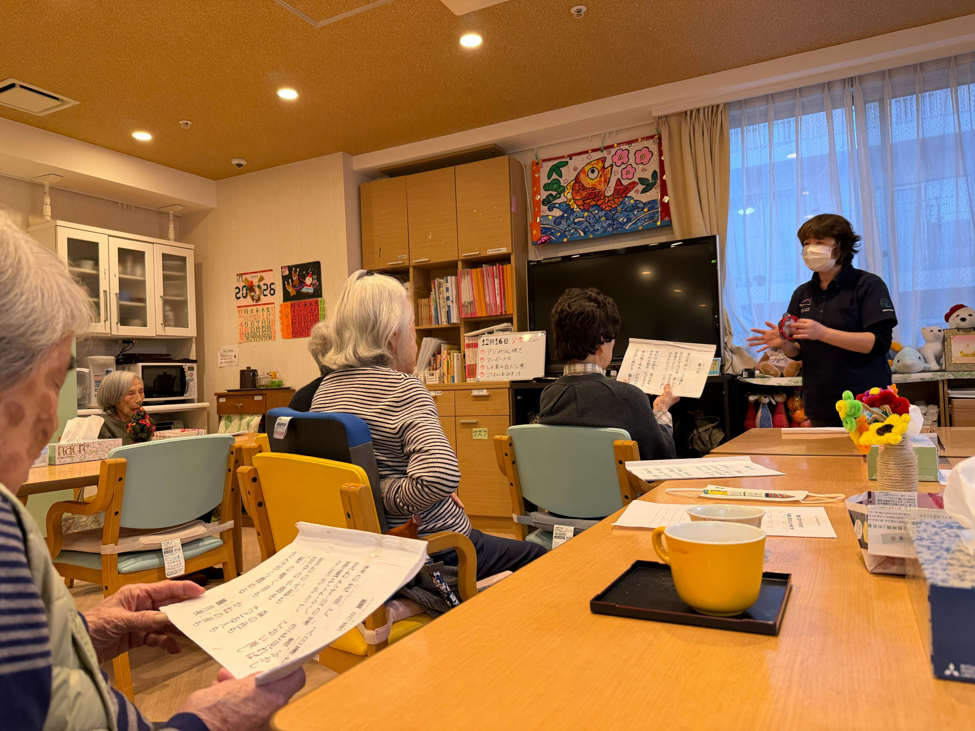 スタッフと利用者様が一緒に歌の紙を見ながら、楽しく歌を歌いました。