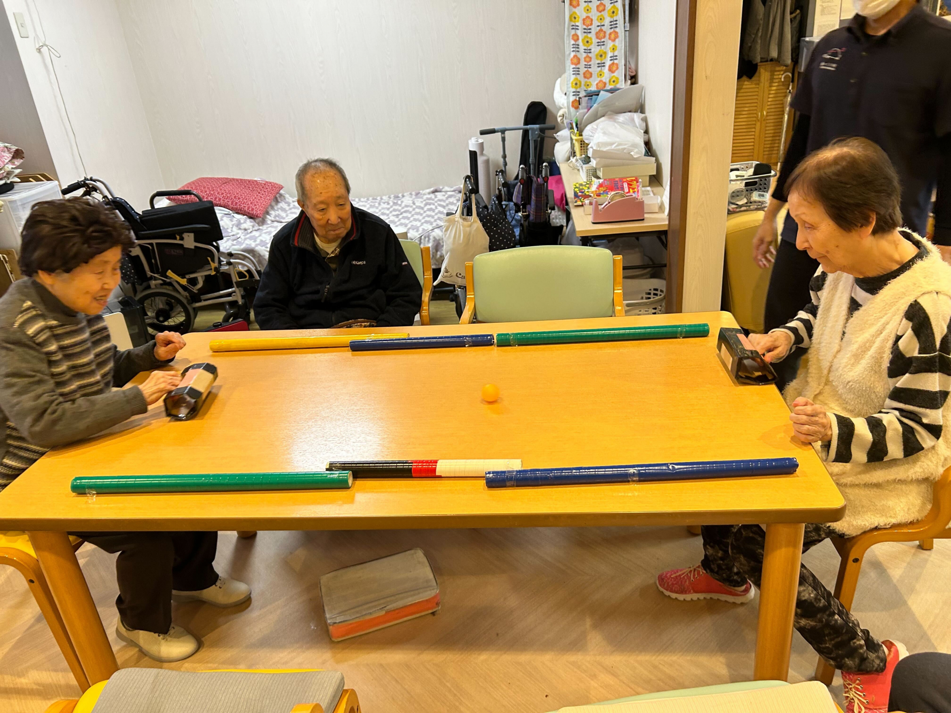 利用者様と一緒にハイパーホッケを行いました。皆さんボールの行方に夢中になり、笑顔や笑い声がたくさん聞こえてきました。