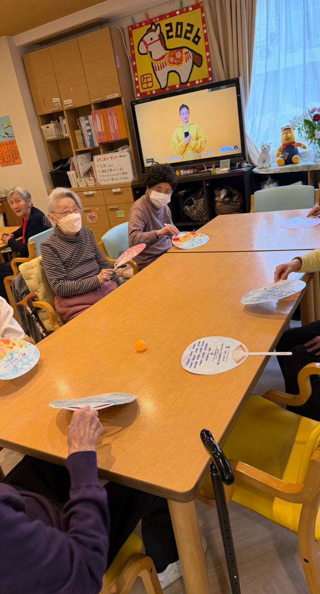 昨日のレクリエーションでは、利用者様みなさんでピンポンボールゲームを行いました。