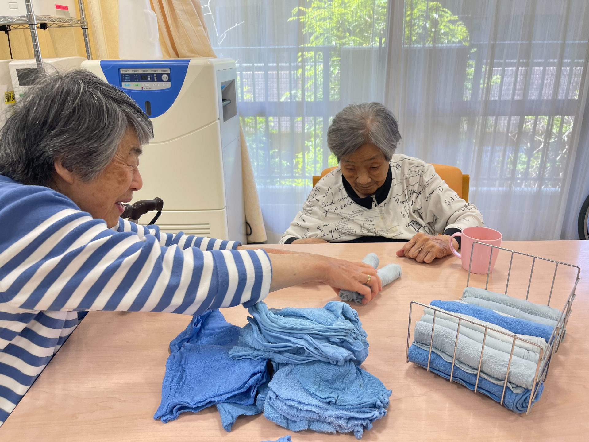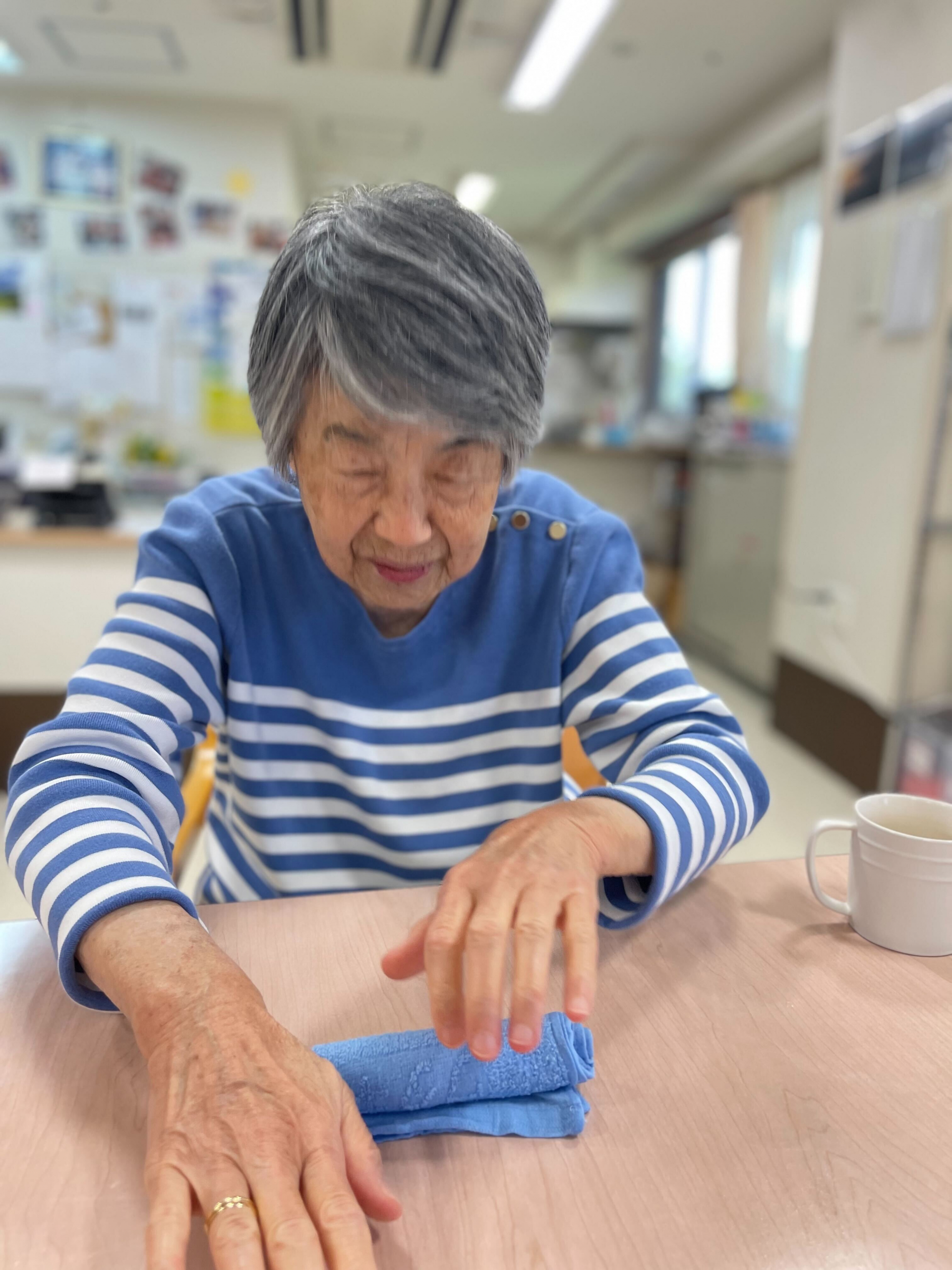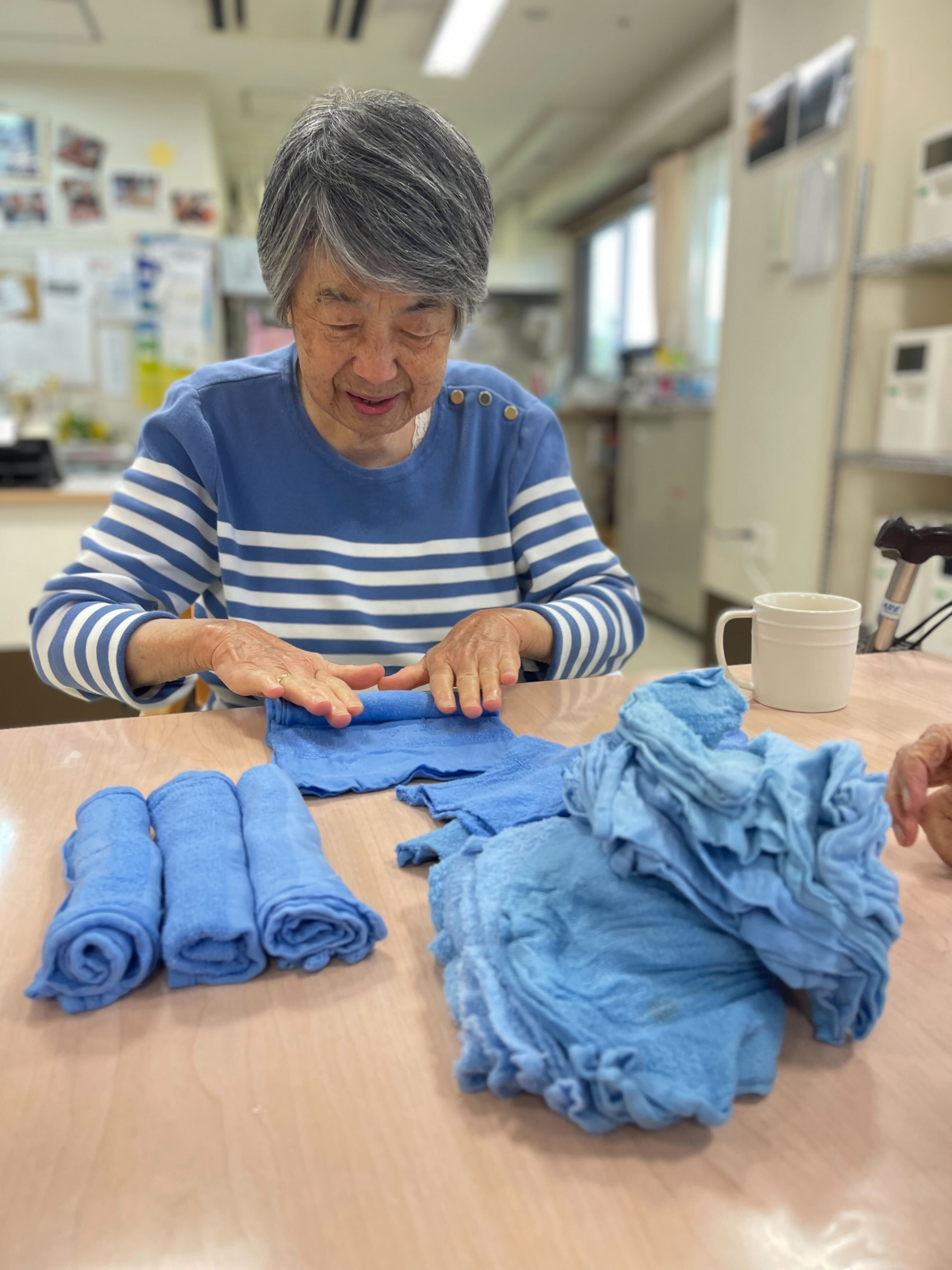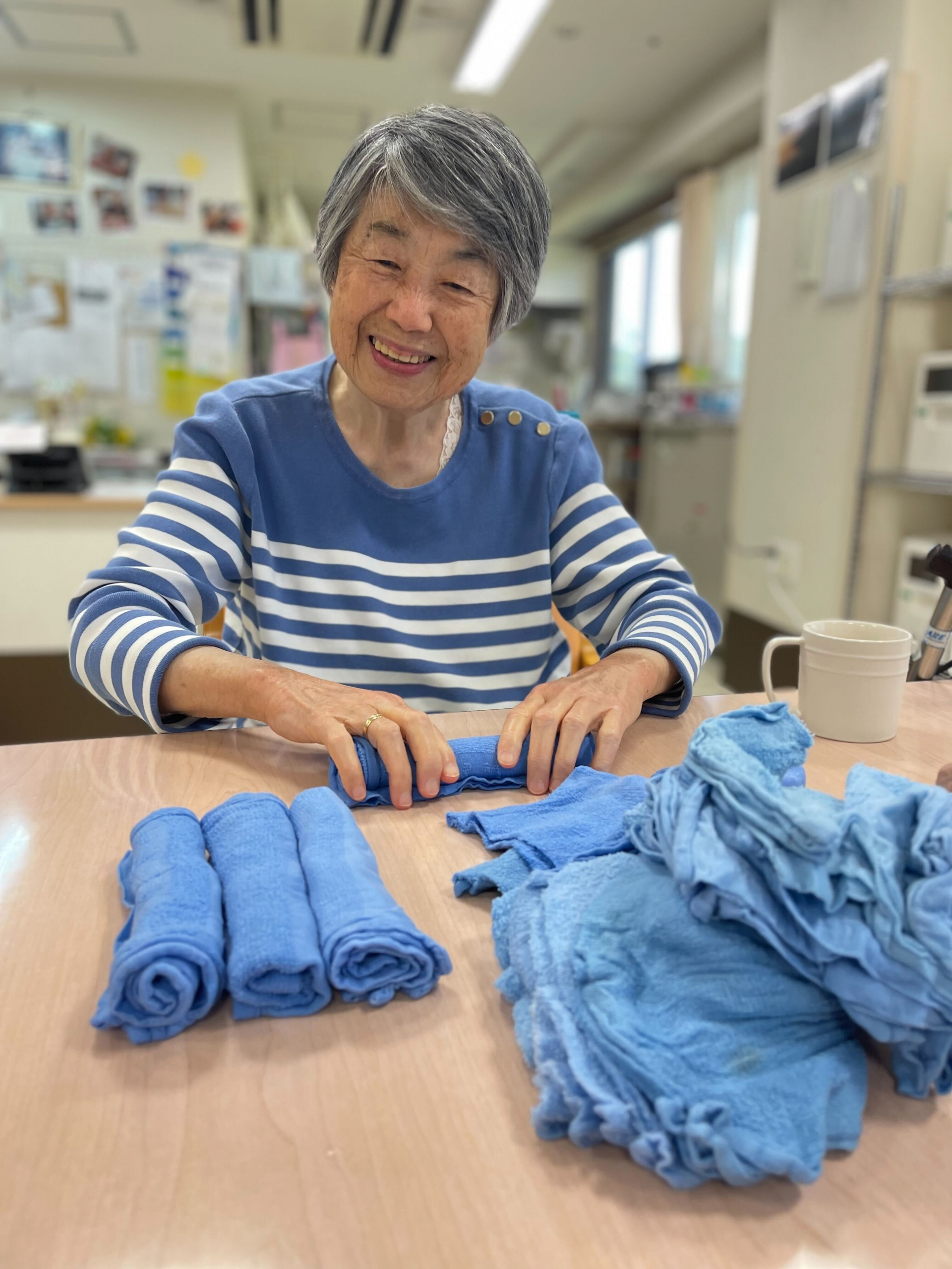 本日2階で一緒に清拭タオルを畳みました。
