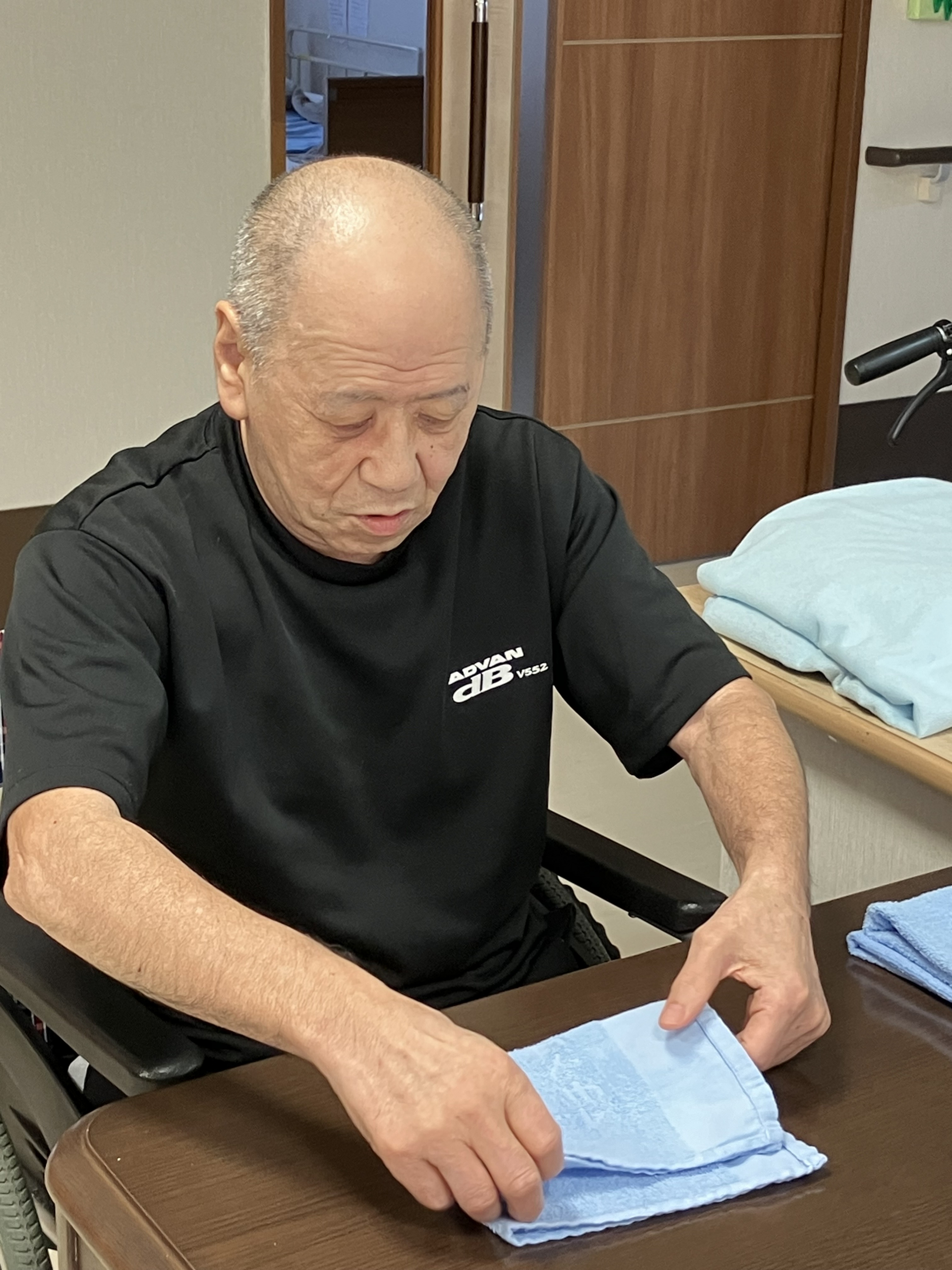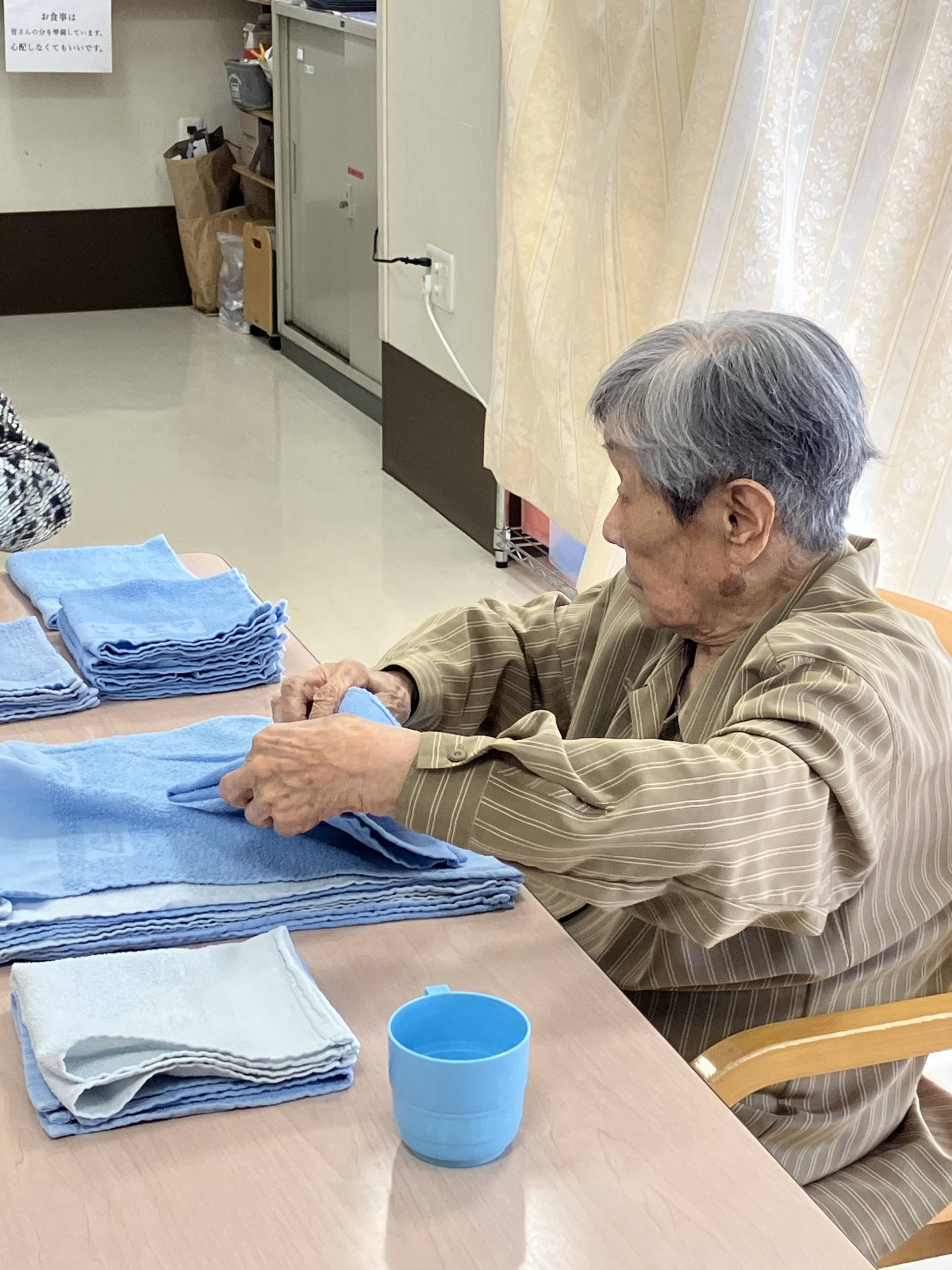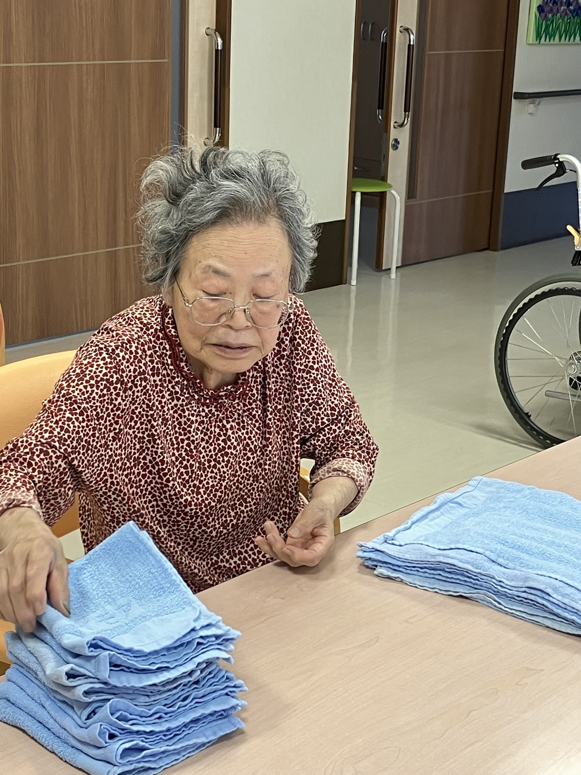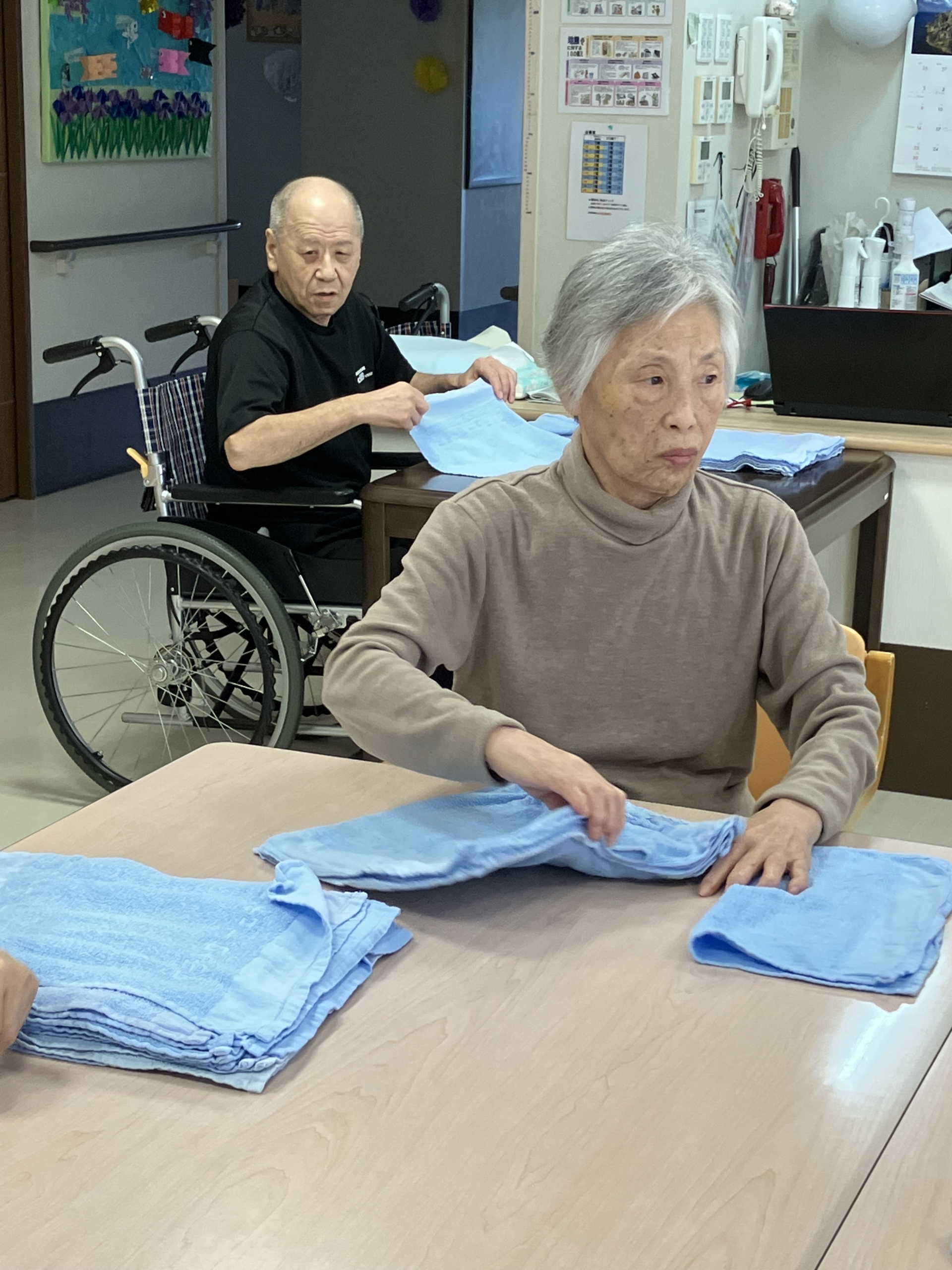 毎土曜日、ワタキューからタオルを届く日なので、届いたら皆で畳んで頂きました。
