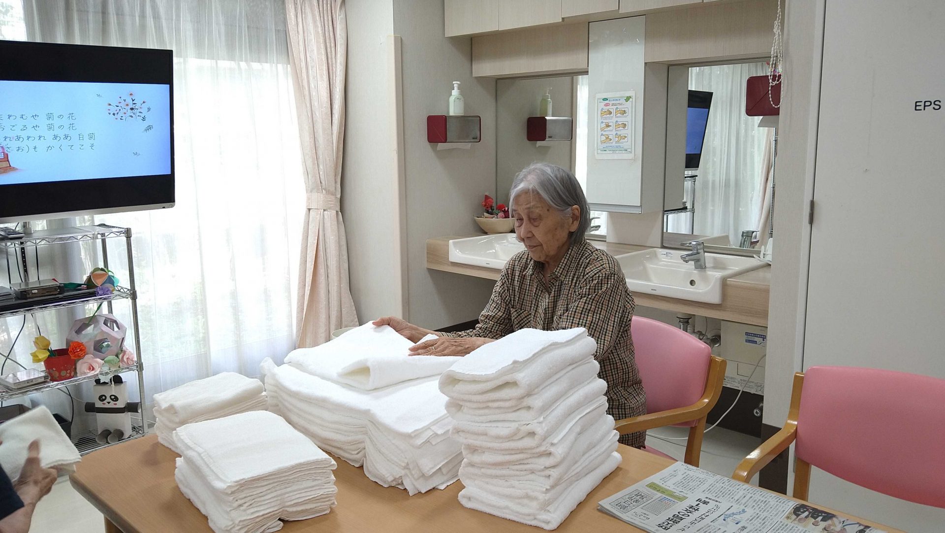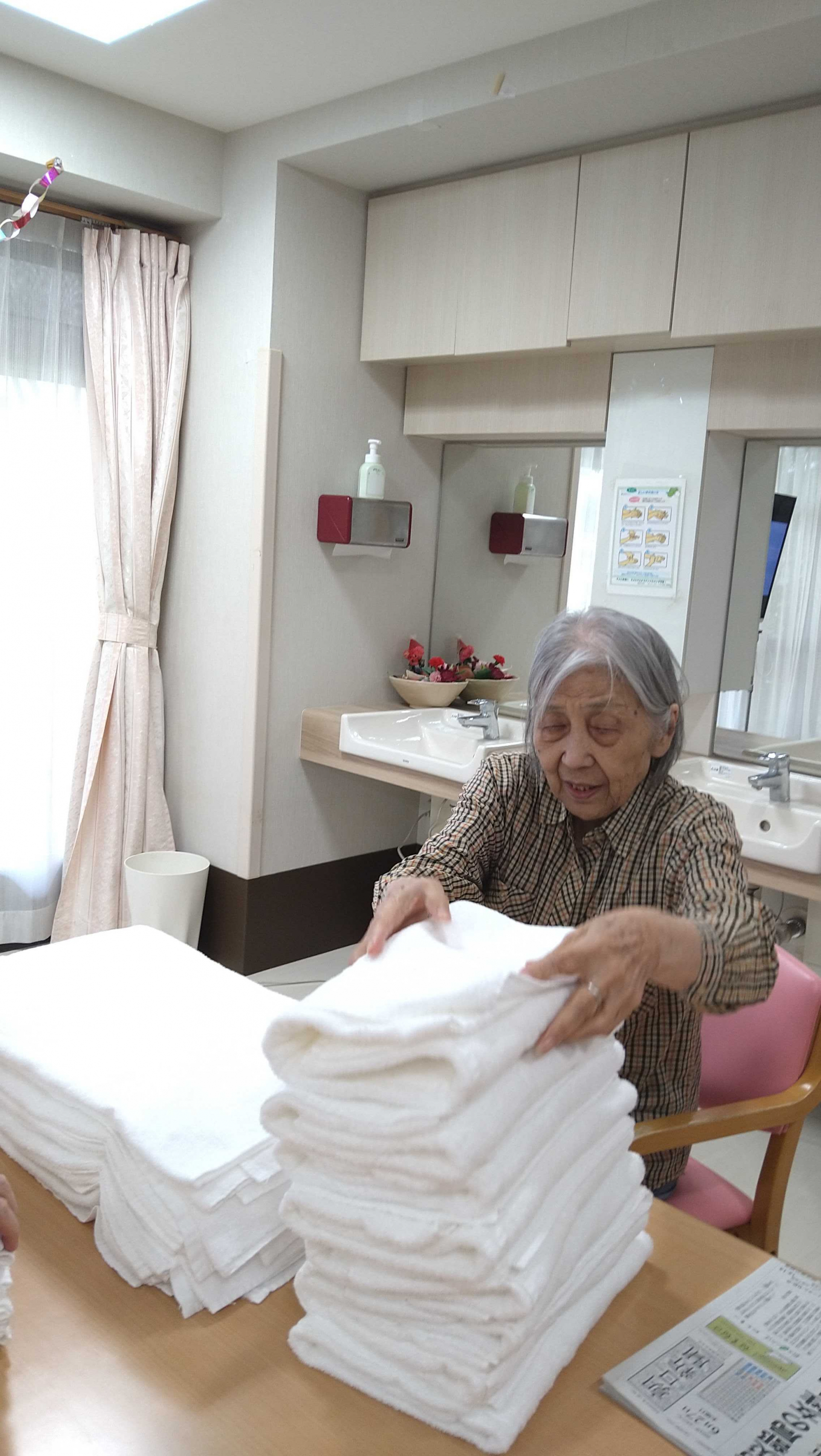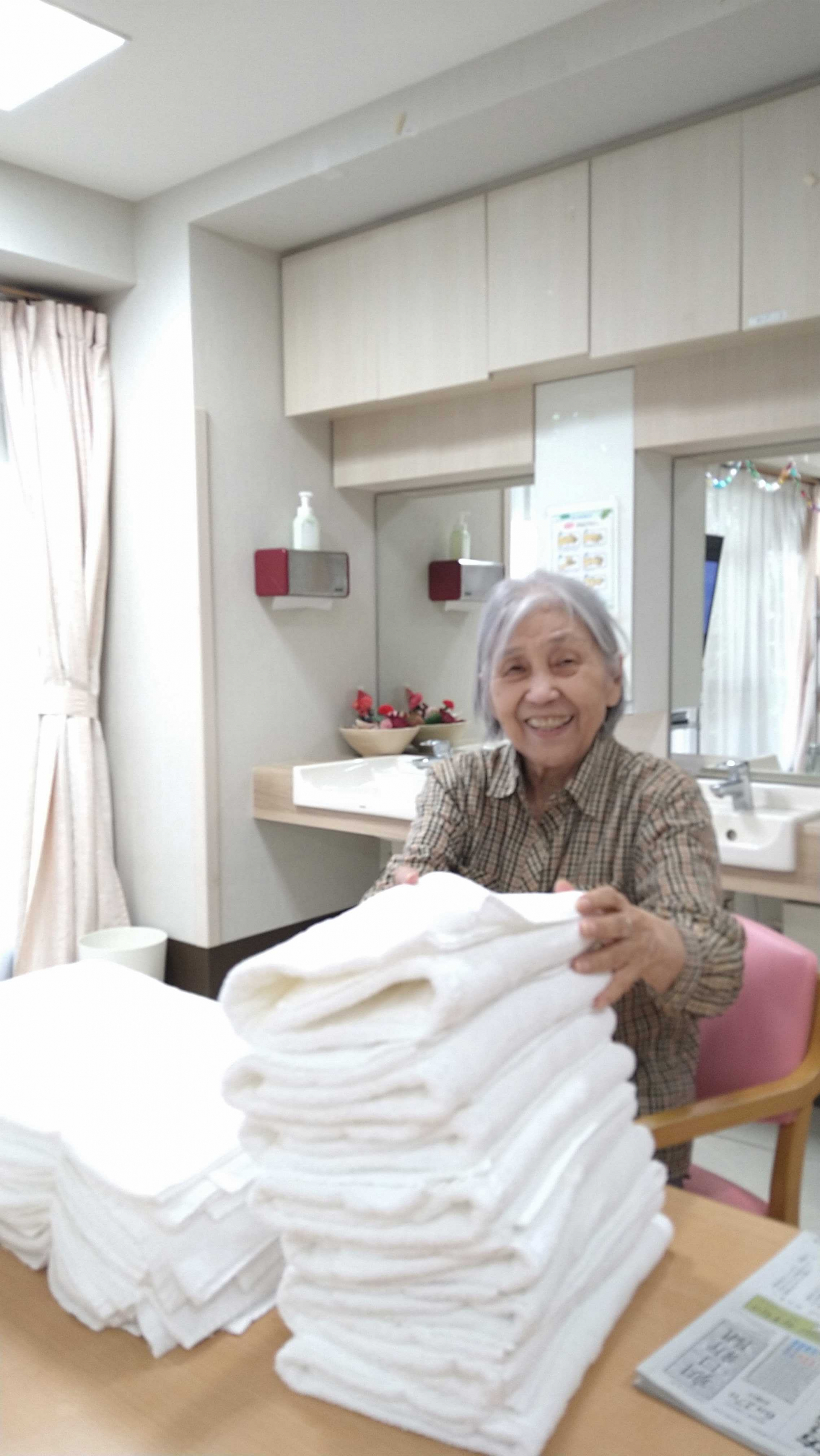 お風呂場のタオルがそろそろ無くなりそうなので、*様がとても頼りになり畳んで頂きました。