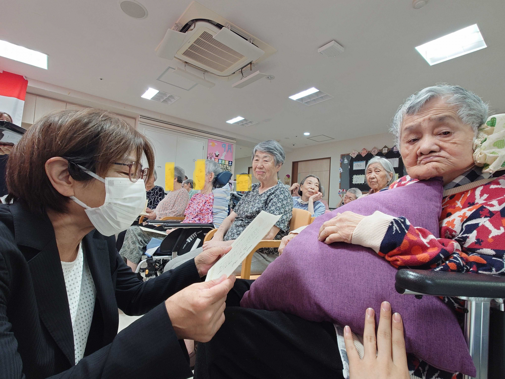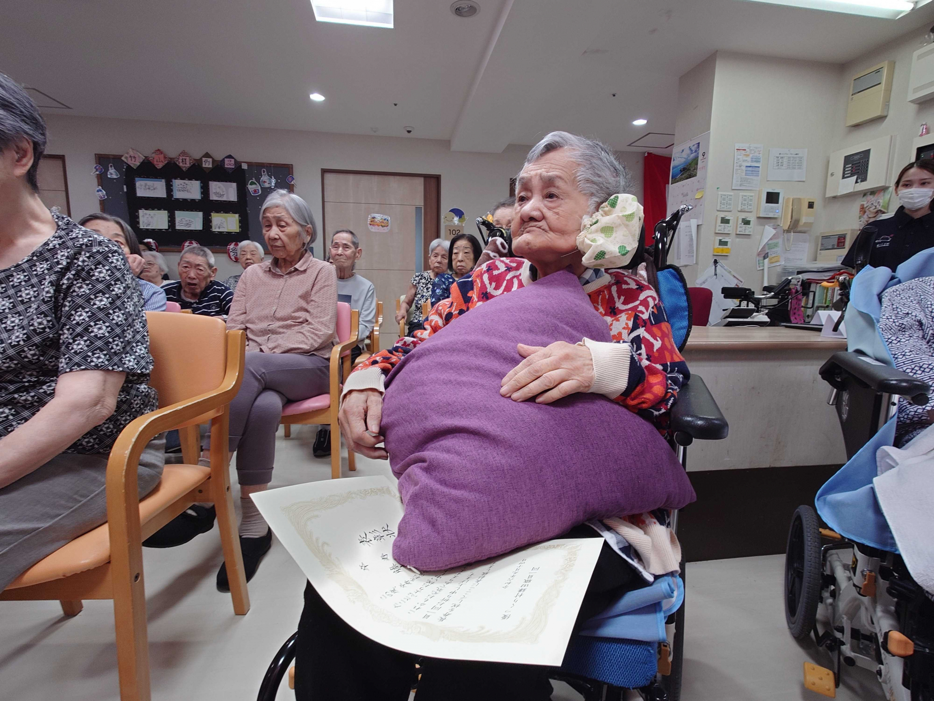 2024.09.14 活動報告 【1F】ご長寿祝賀会・表彰 Tweet シェアする ご長寿祝賀会で表彰されたF様です。 おめでとうございます! 皆様のご長寿をお祝いさせて頂き、私達も本当にうれしいです。^^ これからも、素敵に歳を重ねてください! 優っくりグループホーム鎌田 エヴァ 前の記事 2024.09.15 活動報告 【2F】タオル畳み 次の記事 2024.09.14 活動報告 【1F】ご長寿祝賀会のお食事 一覧へ戻る