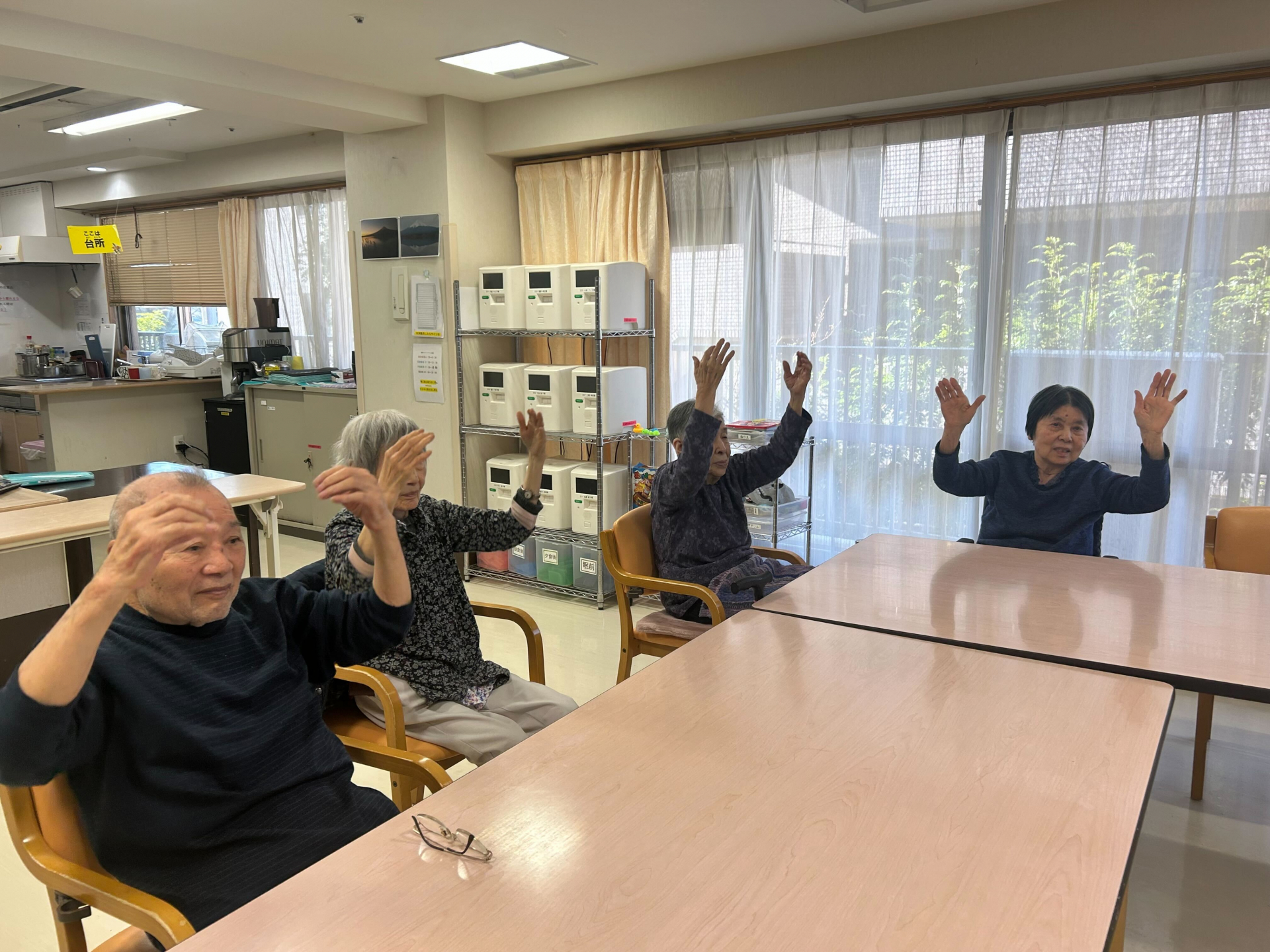 腕をあげたり、背筋を伸ばしたり、無理のない動きで、みんなで一緒に行うことで自然と表情が明るくなってきます♪