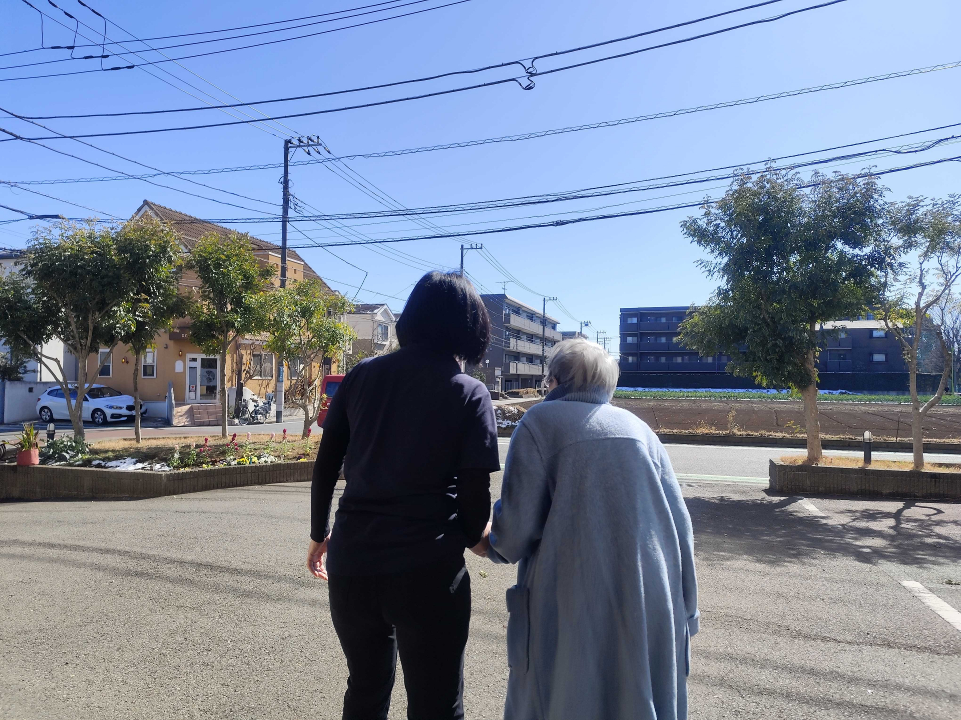 職員と手をつなぎ、一歩一歩ゆっくりと歩かれる利用者様。