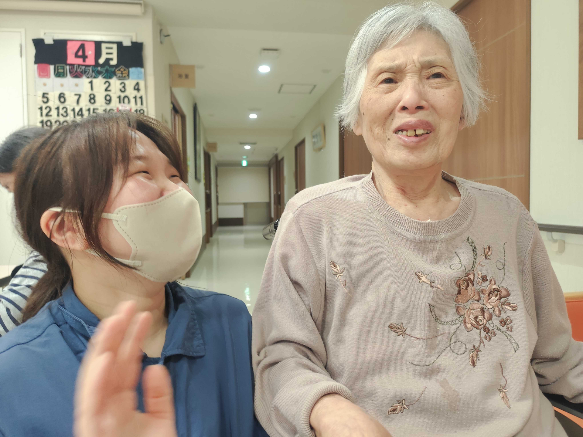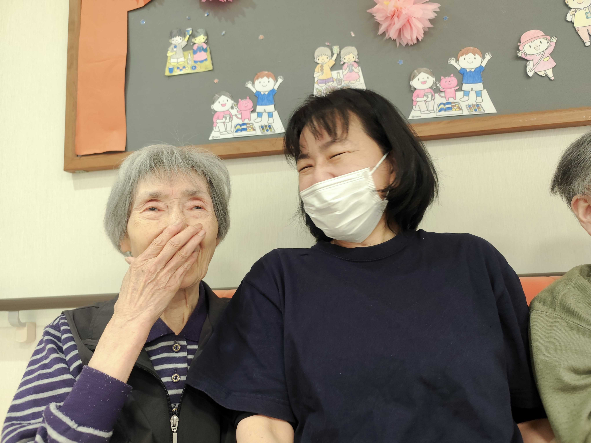【グループホーム やさしい日常】介護施設の日常風景。利用者様と職員が一緒に笑い合う時間