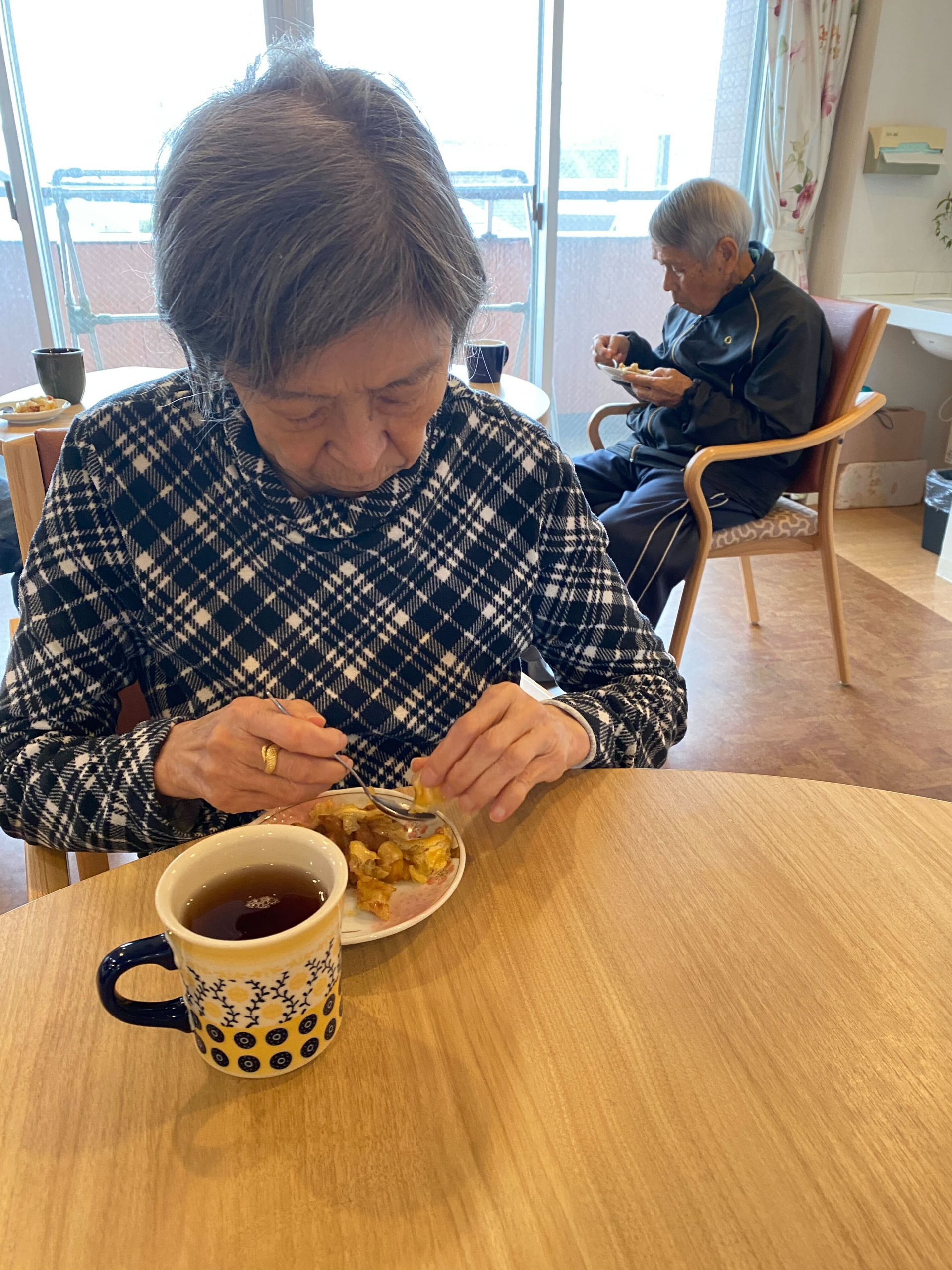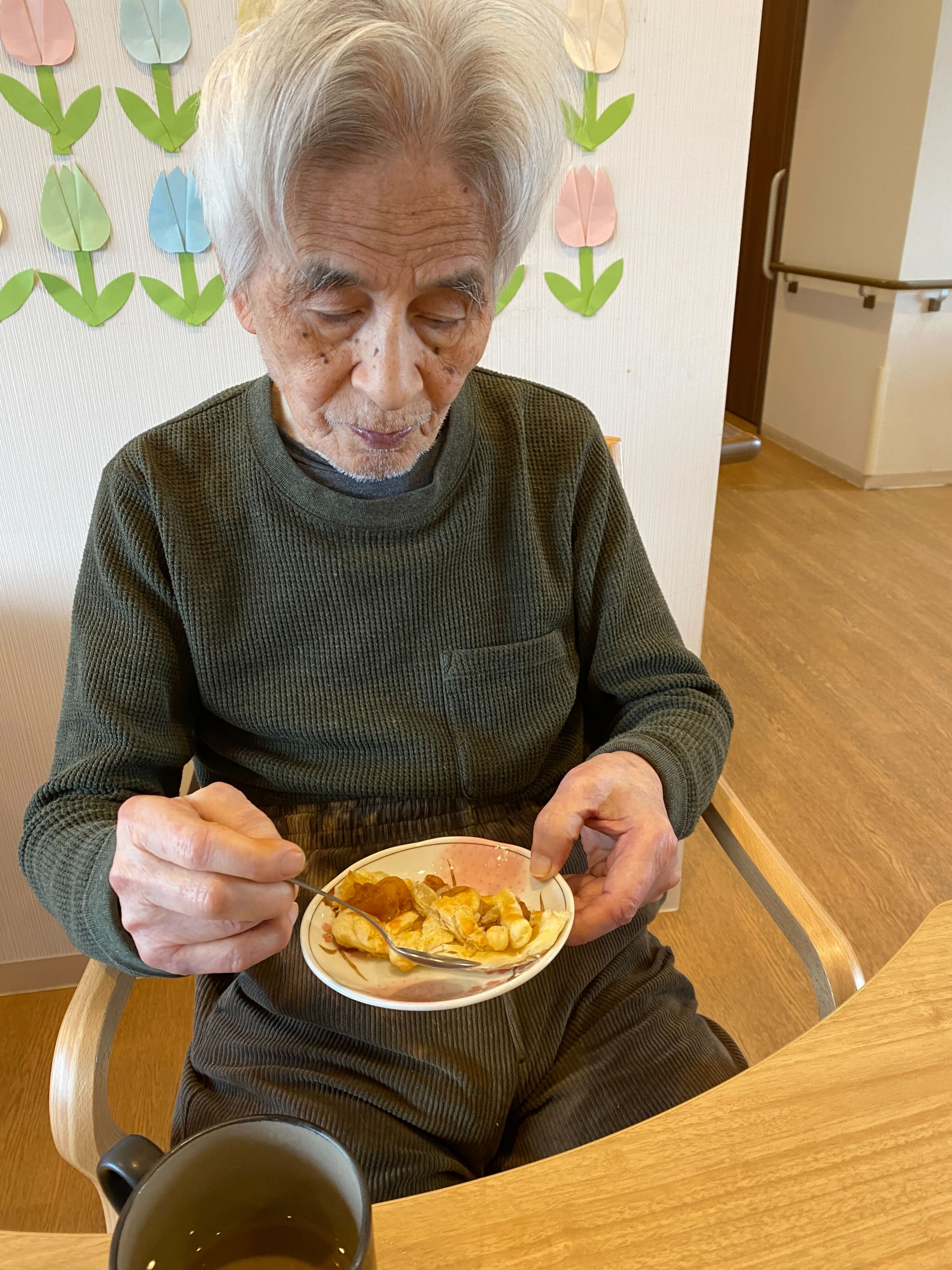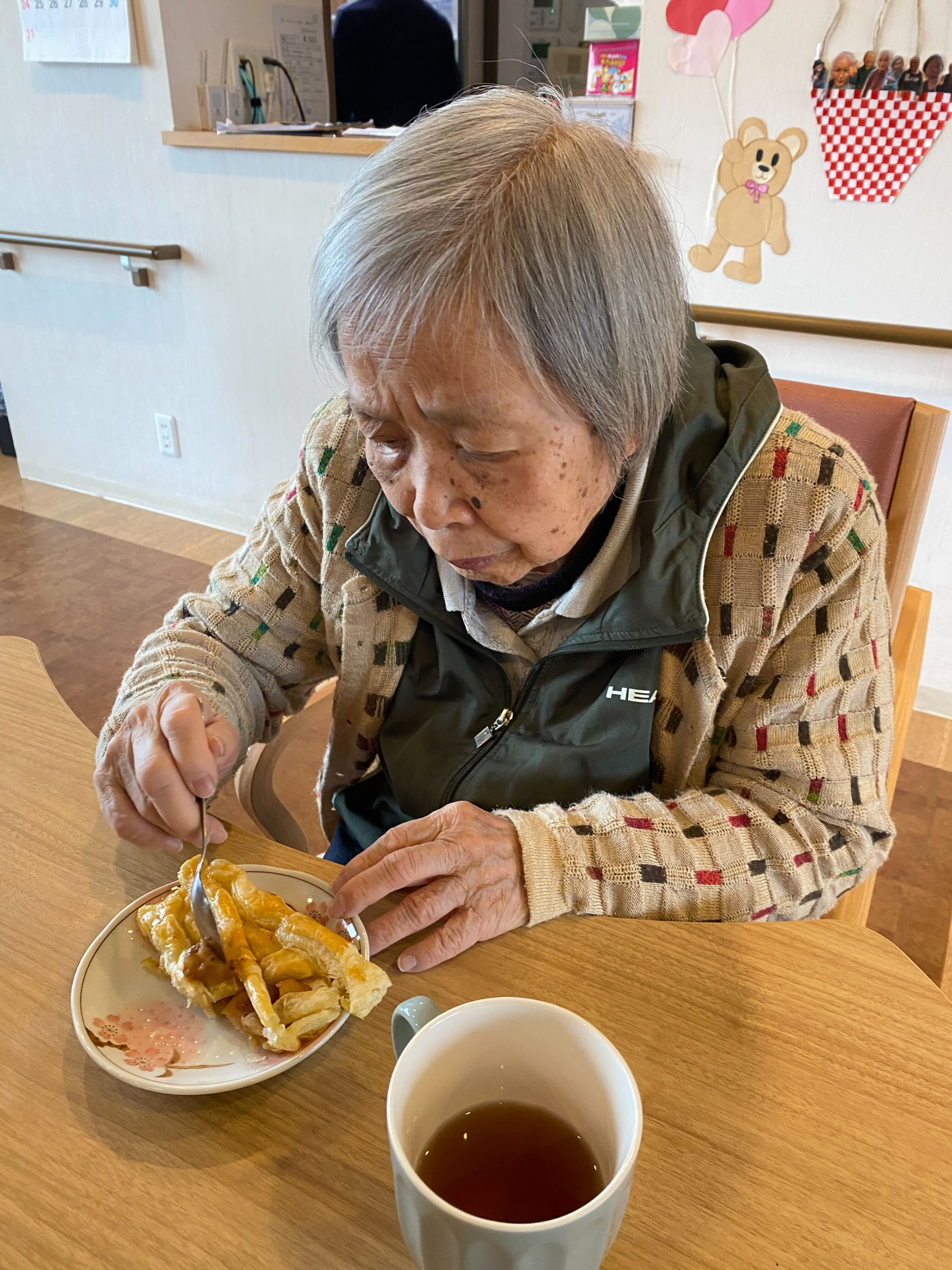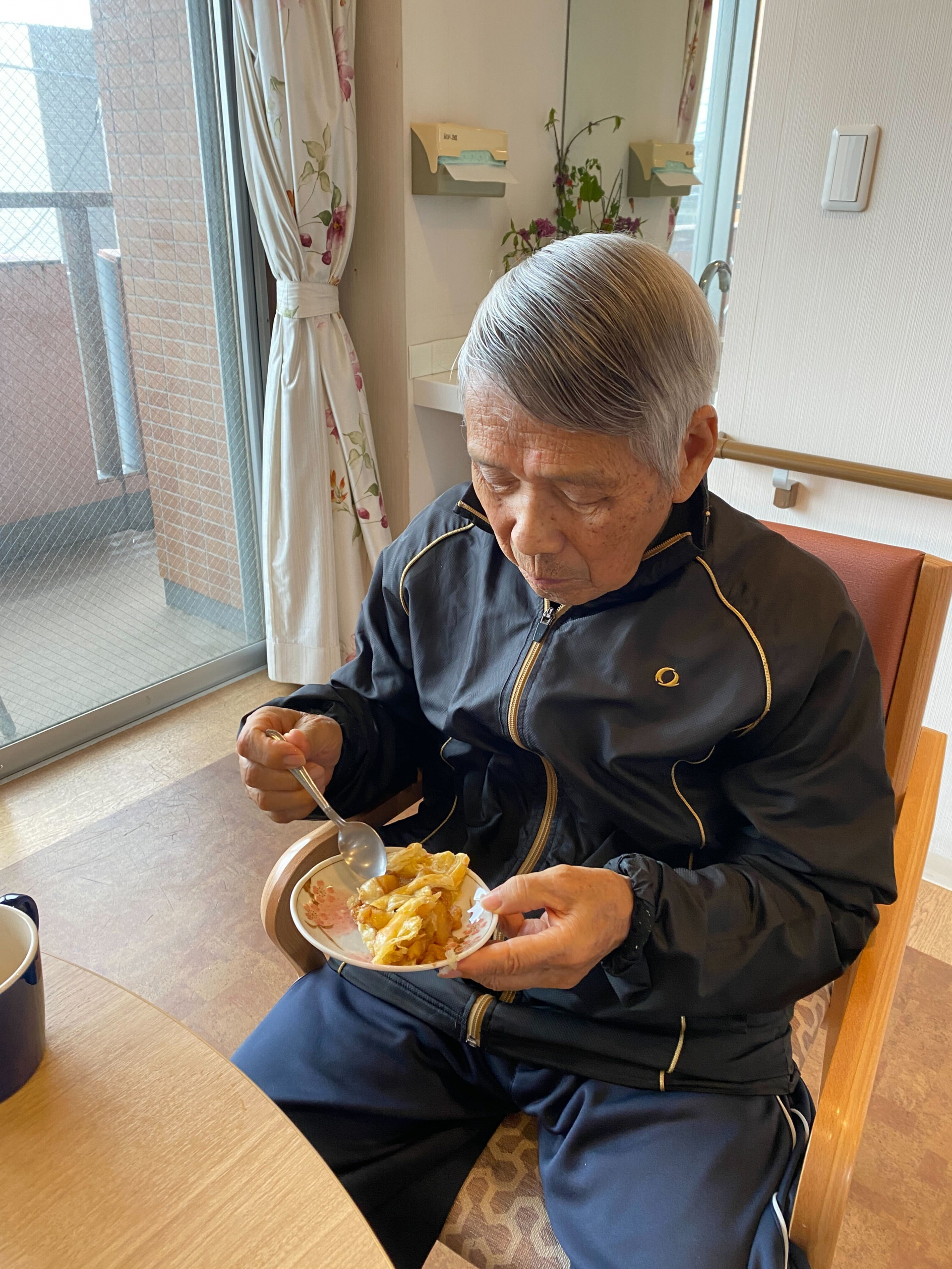 おやつ時に皆様に完成したりんごパイを提供しました。「最高!美味しいよ」「おかわりがあればたべたいぐらいね」と大笑いで仰ってました。もぐもぐ召し上がってくれて、口に合ってよかったです。