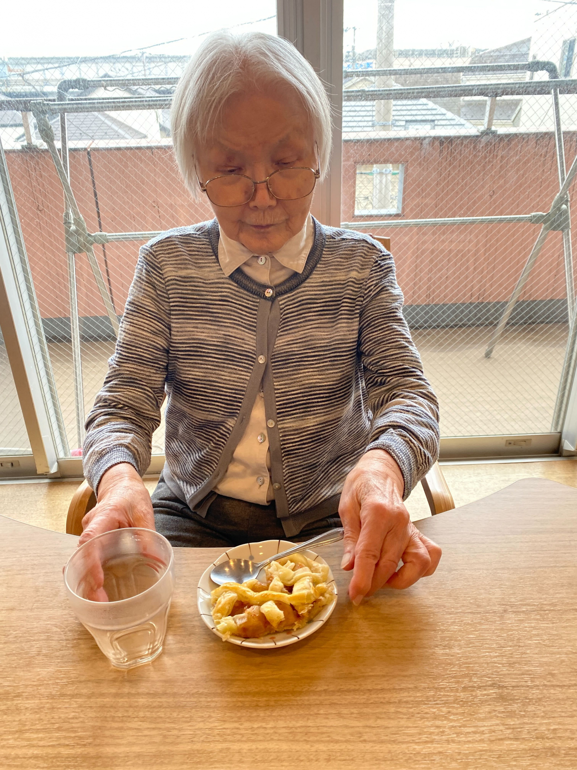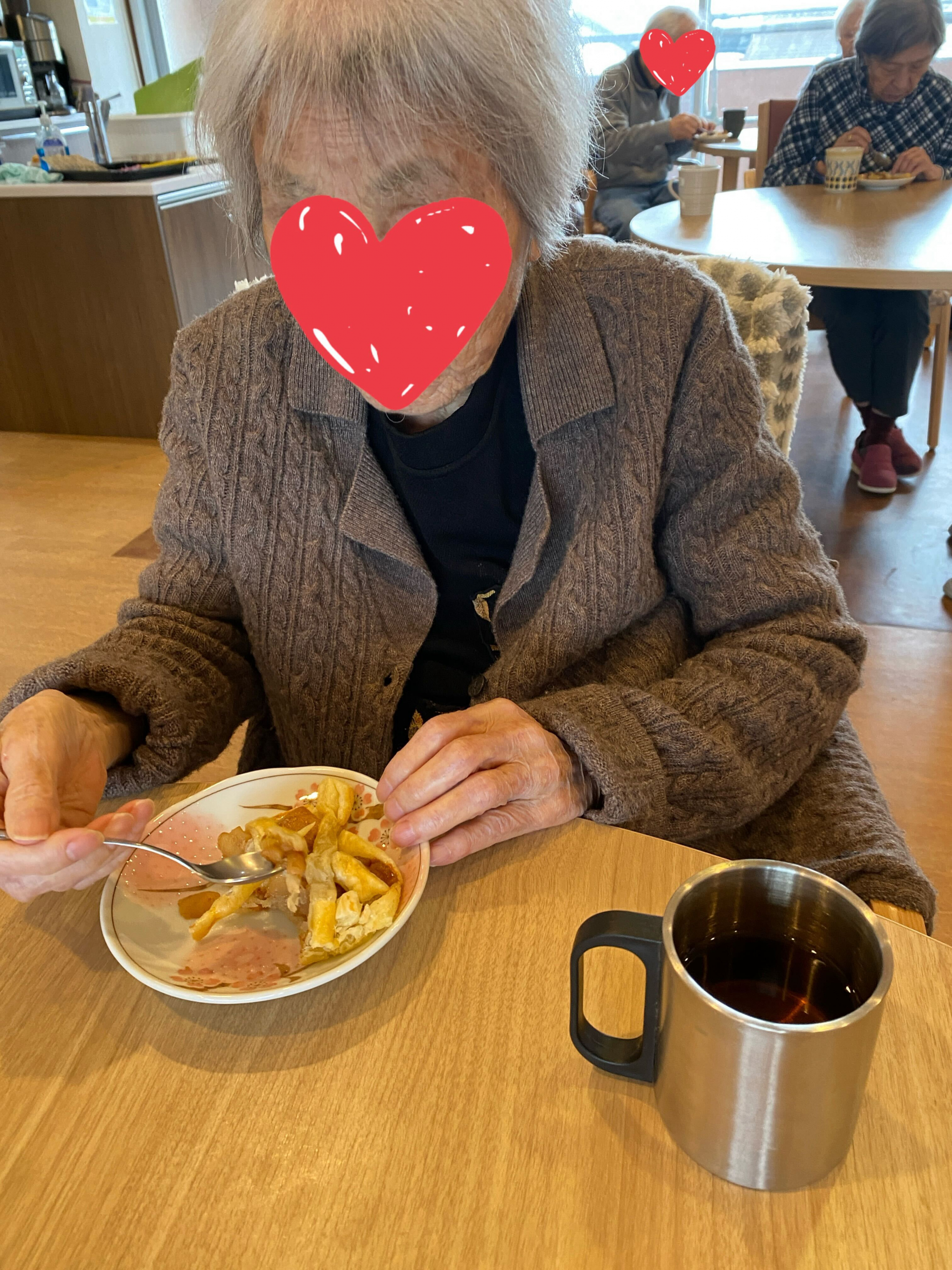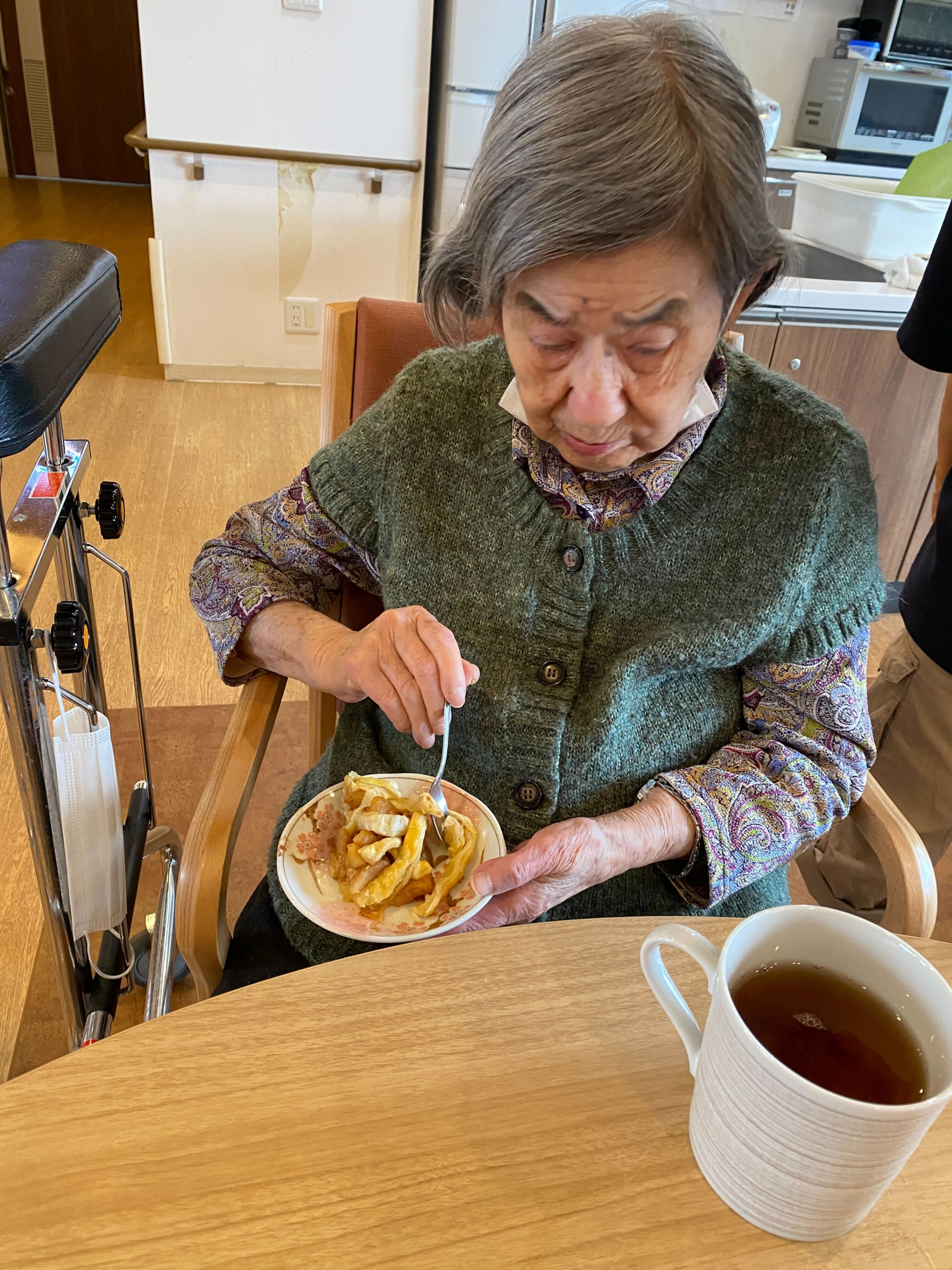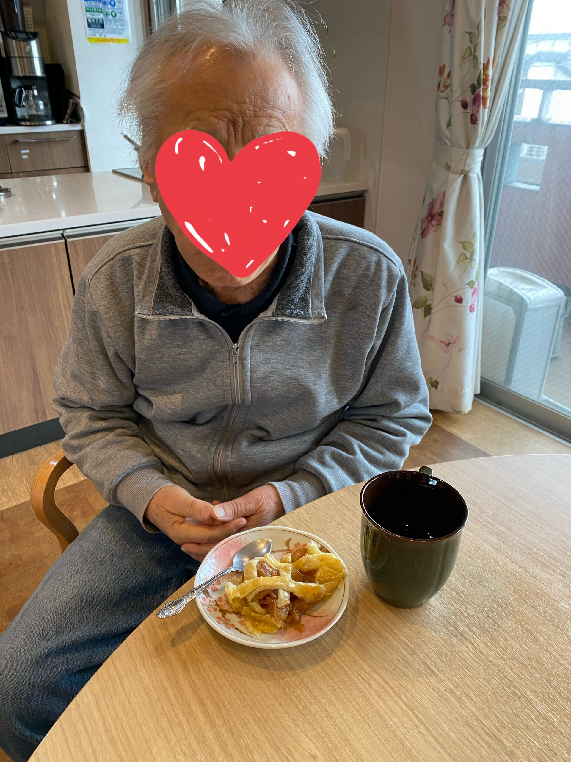 おやつ時に皆様に完成したりんごパイを提供しました。「最高!美味しいよ」「おかわりがあればたべたいぐらいね」と大笑いで仰ってました。もぐもぐ召し上がってくれて、口に合ってよかったです。