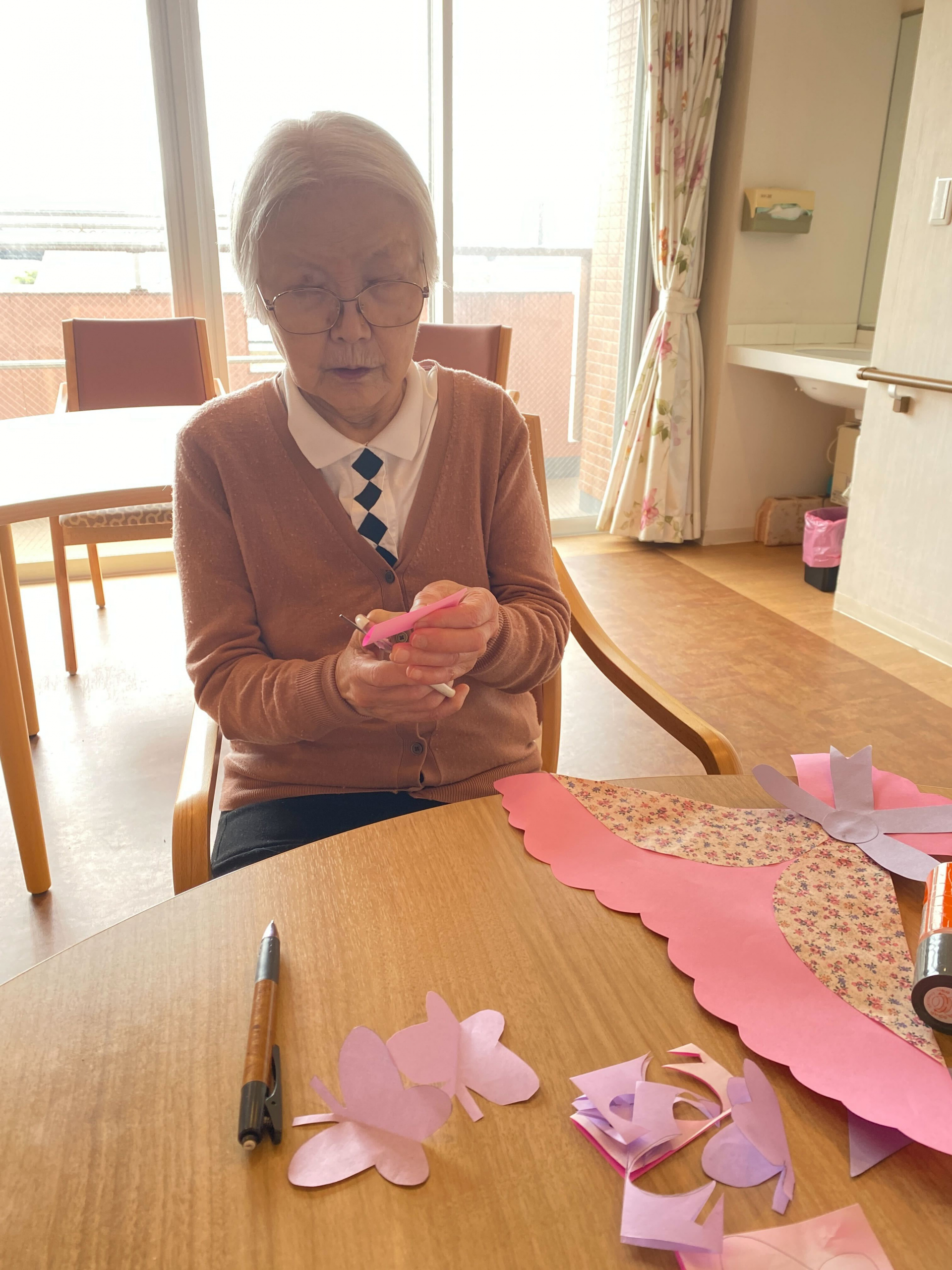 カーネーションのお花を切って終わったら、次はチョウを作ってました。全ての準備ができ、壁に飾り付けをしました。