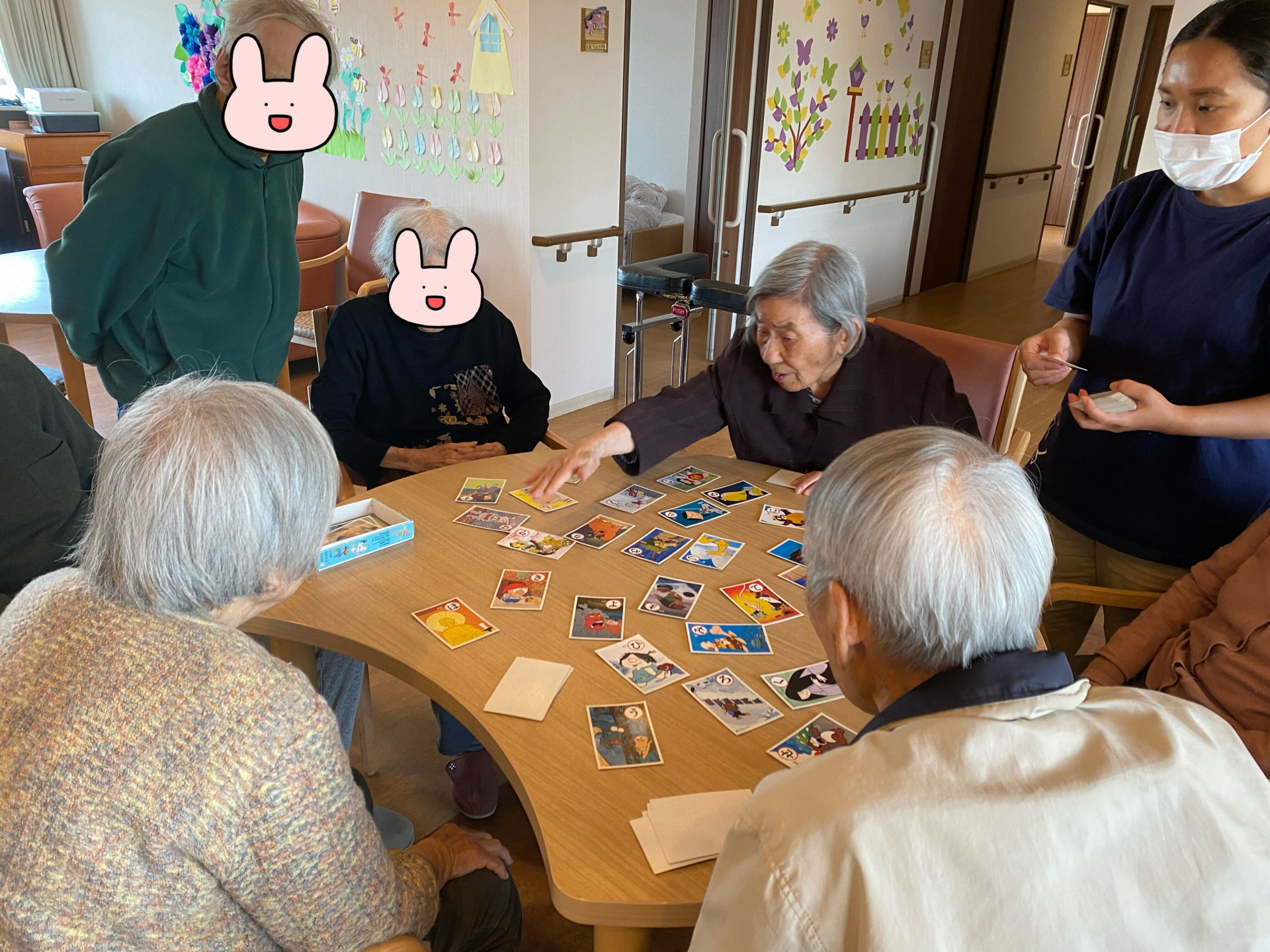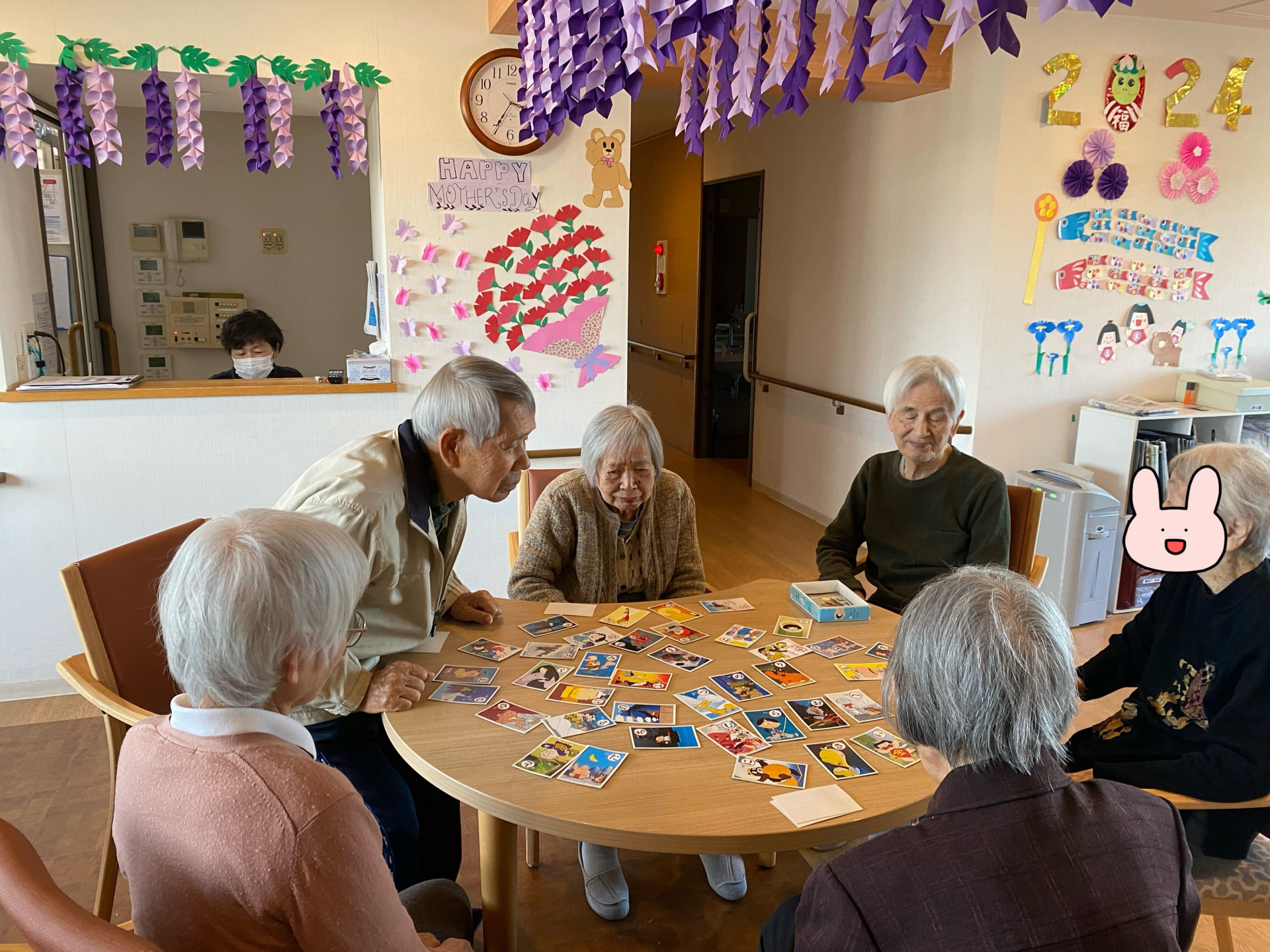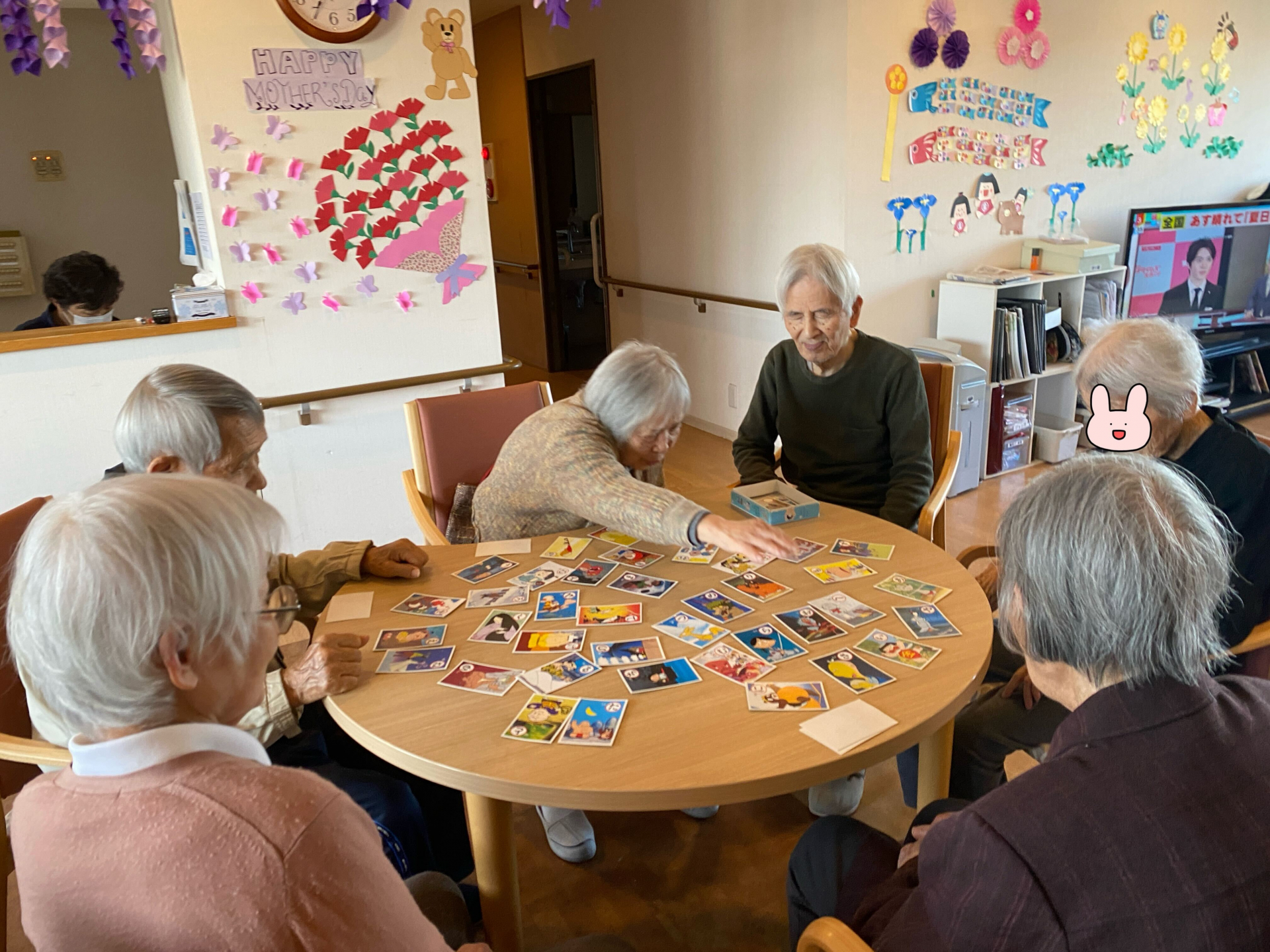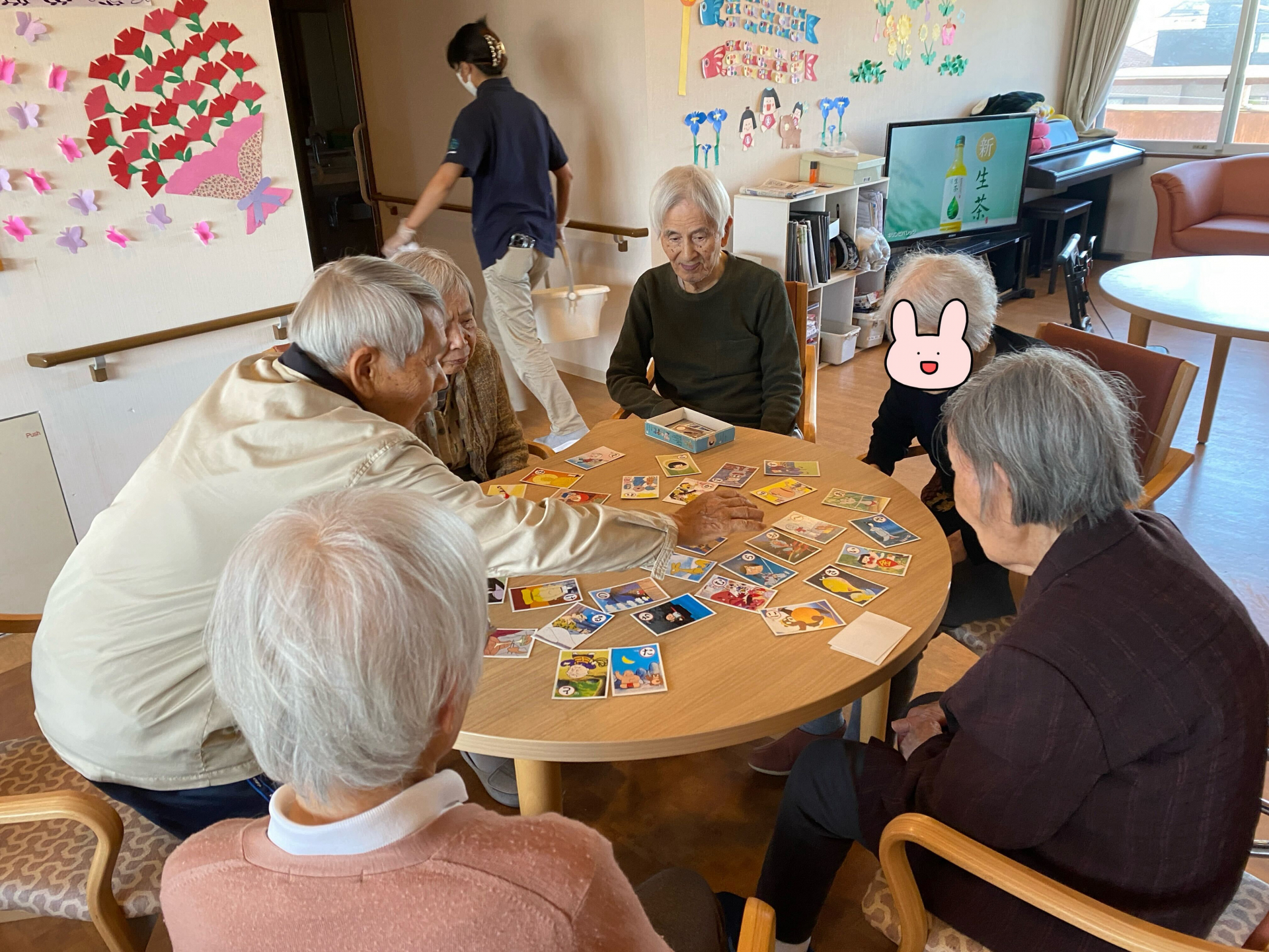 おやつ後に皆様での集めてカルタを行いました。真面目に聞いて狙って探してくださるので、どんどん絵札を取れました。