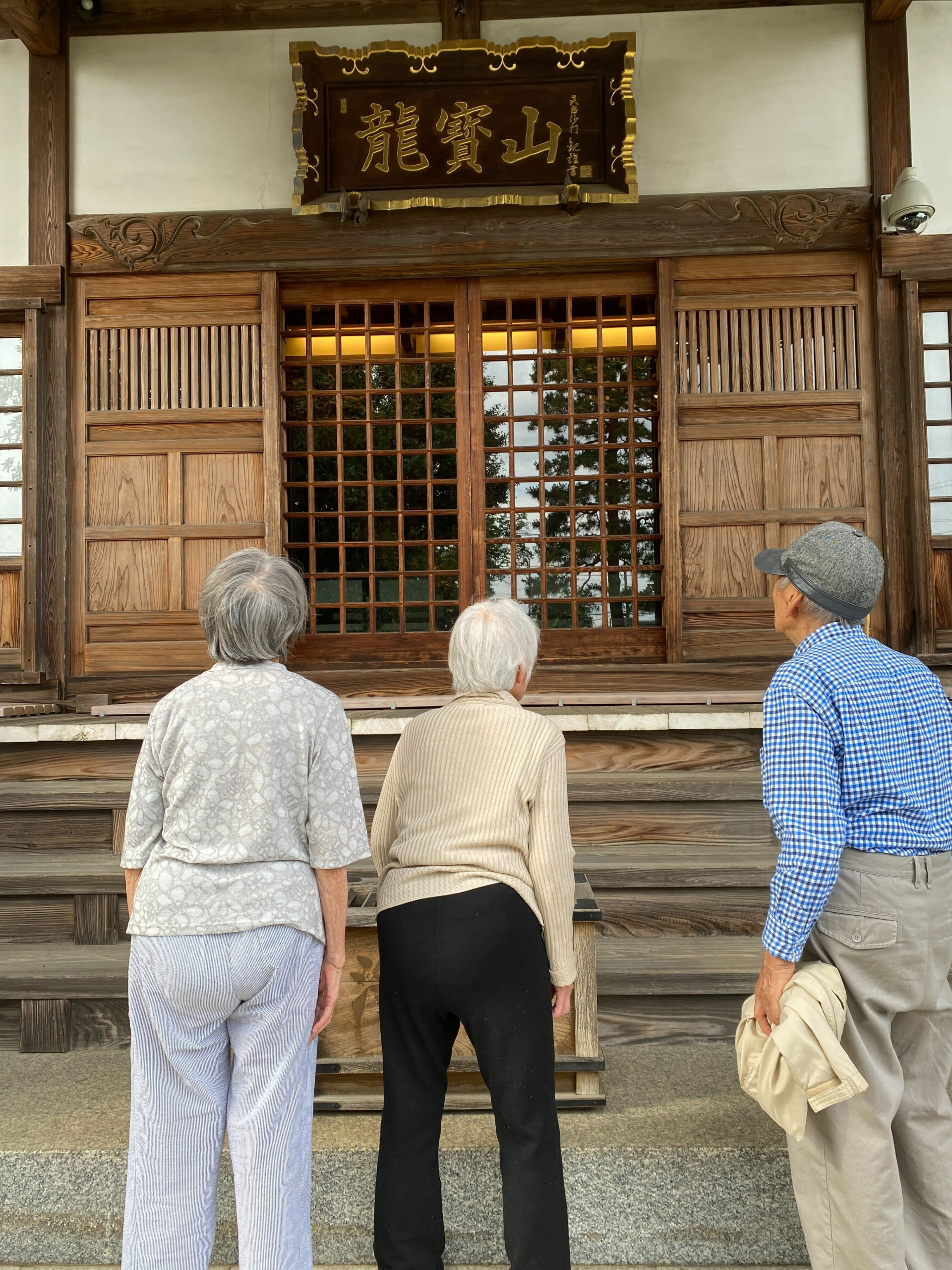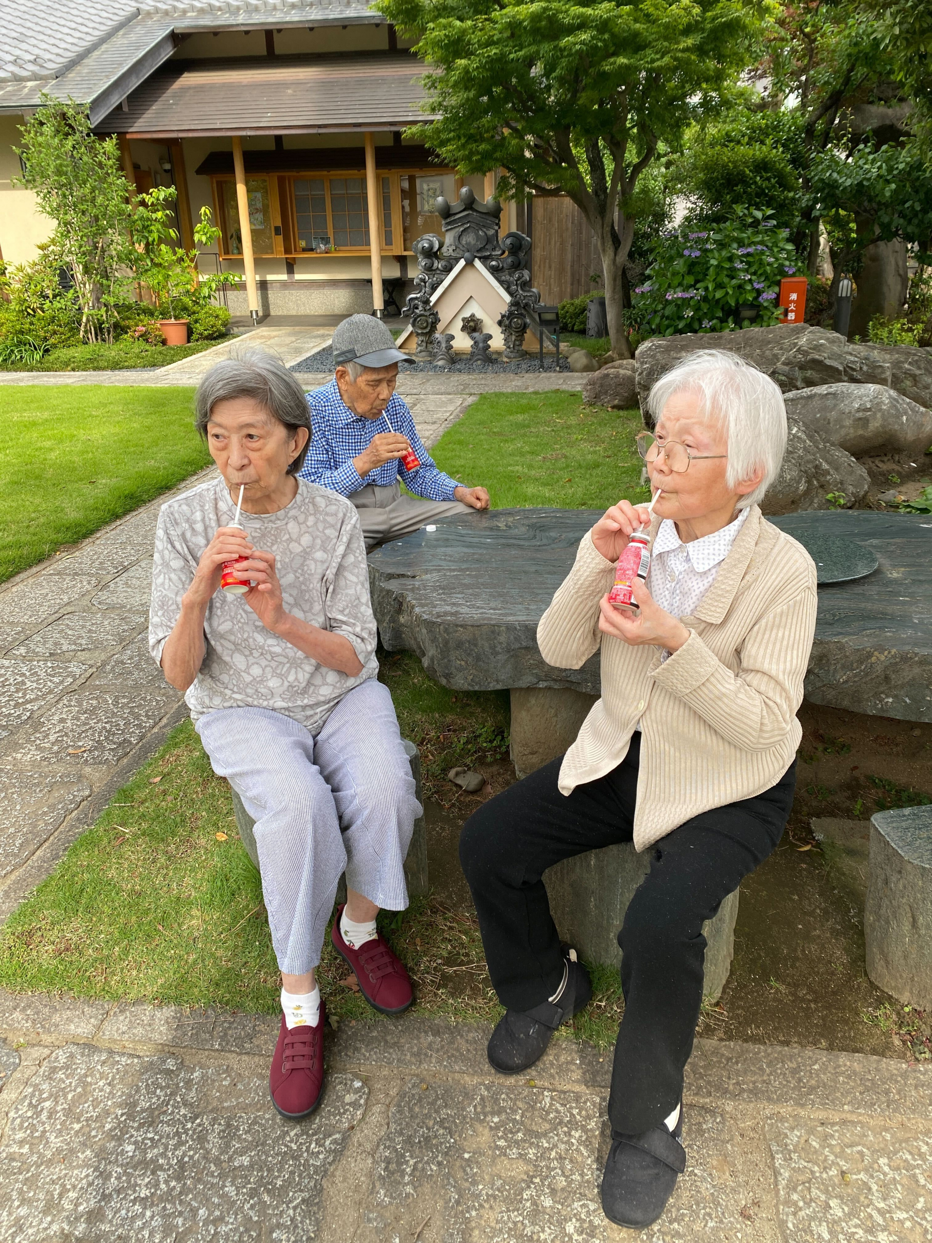 天気が良くて、皆様と近くのお寺にお参りに行ってきました。お寺の周辺に小さい公園があって、飲みながら少し休んでました。