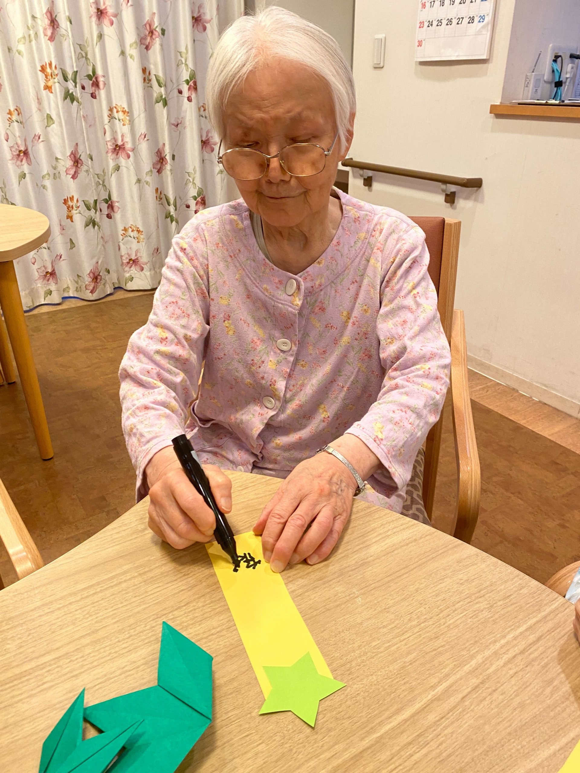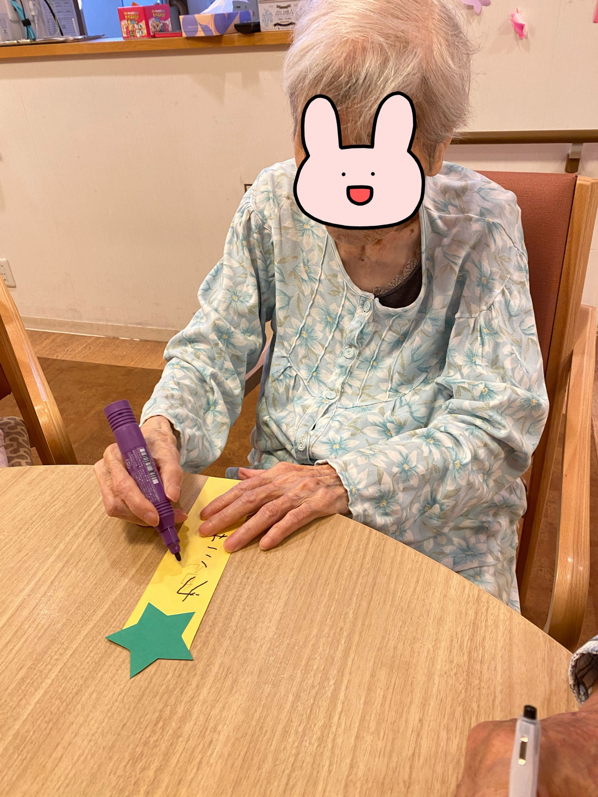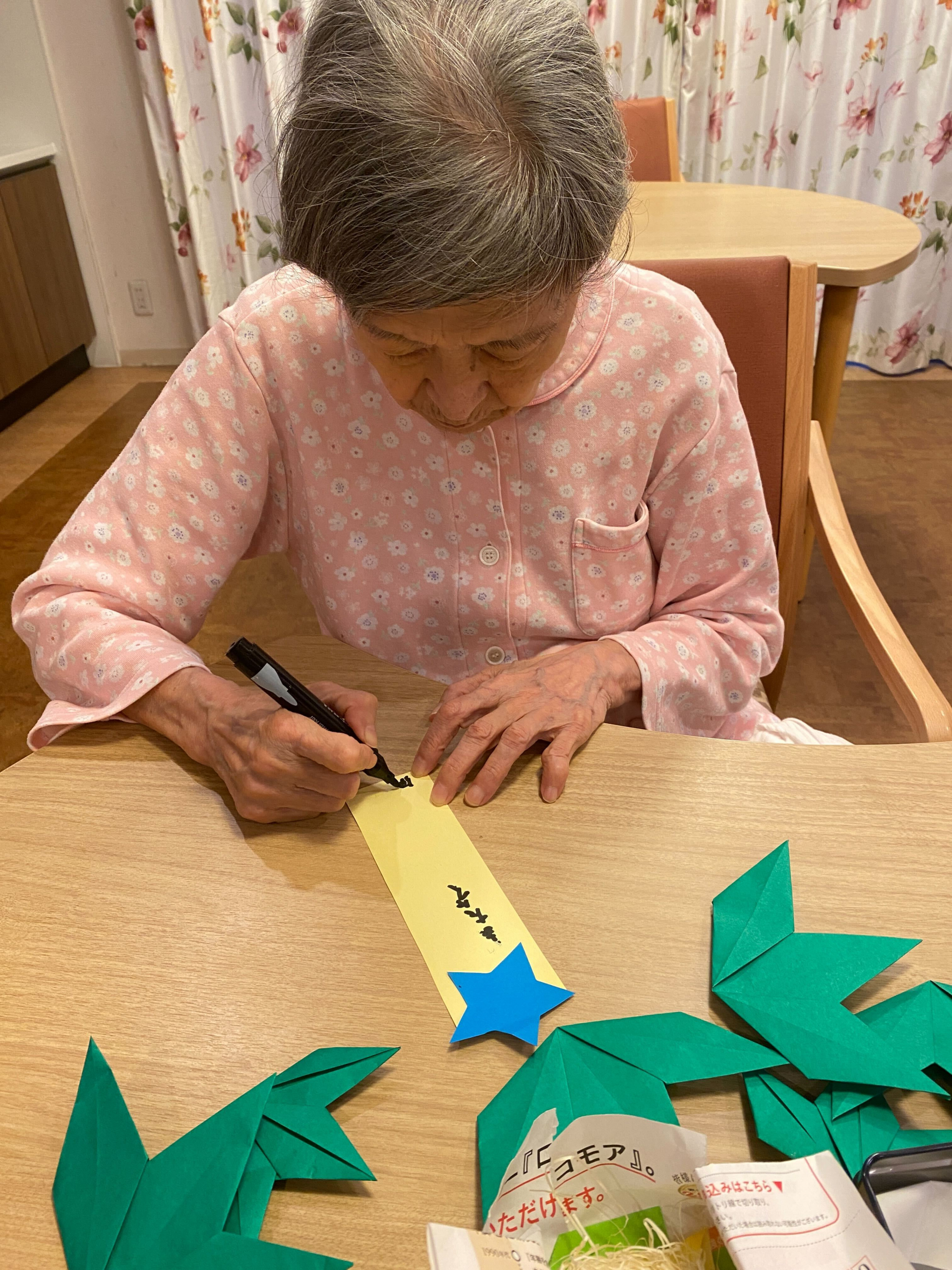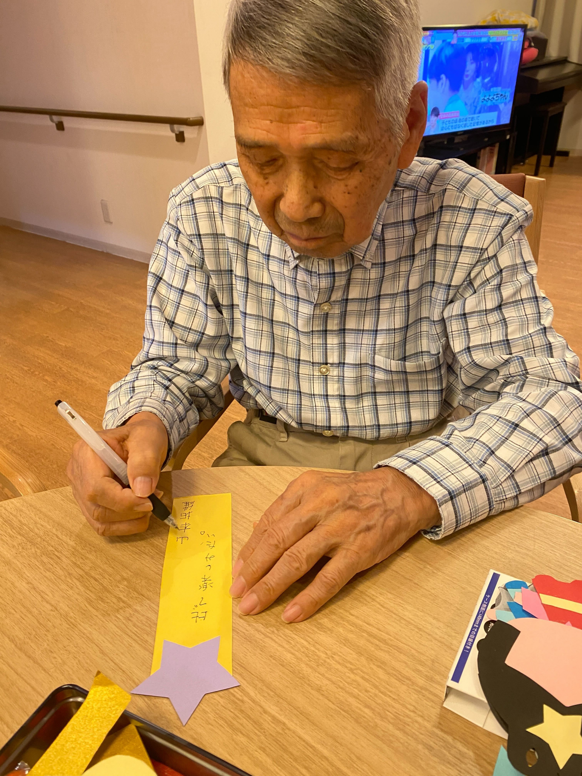 ある日、寝る準備が終わって、皆様にこれから七夕祭りですよ、何かお願い事を書いてくれませんかと尋ねると「ええ?なんだろう?」「急にそういうふうに言われたら、わからないのよ」と笑顔で仰ってました。