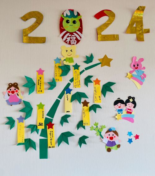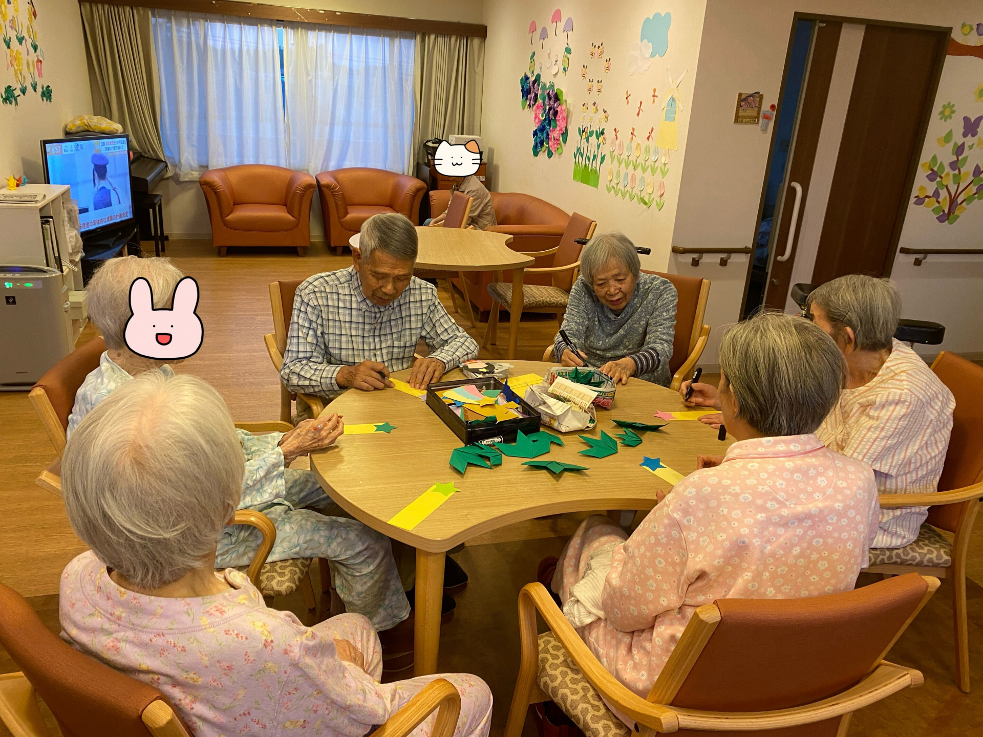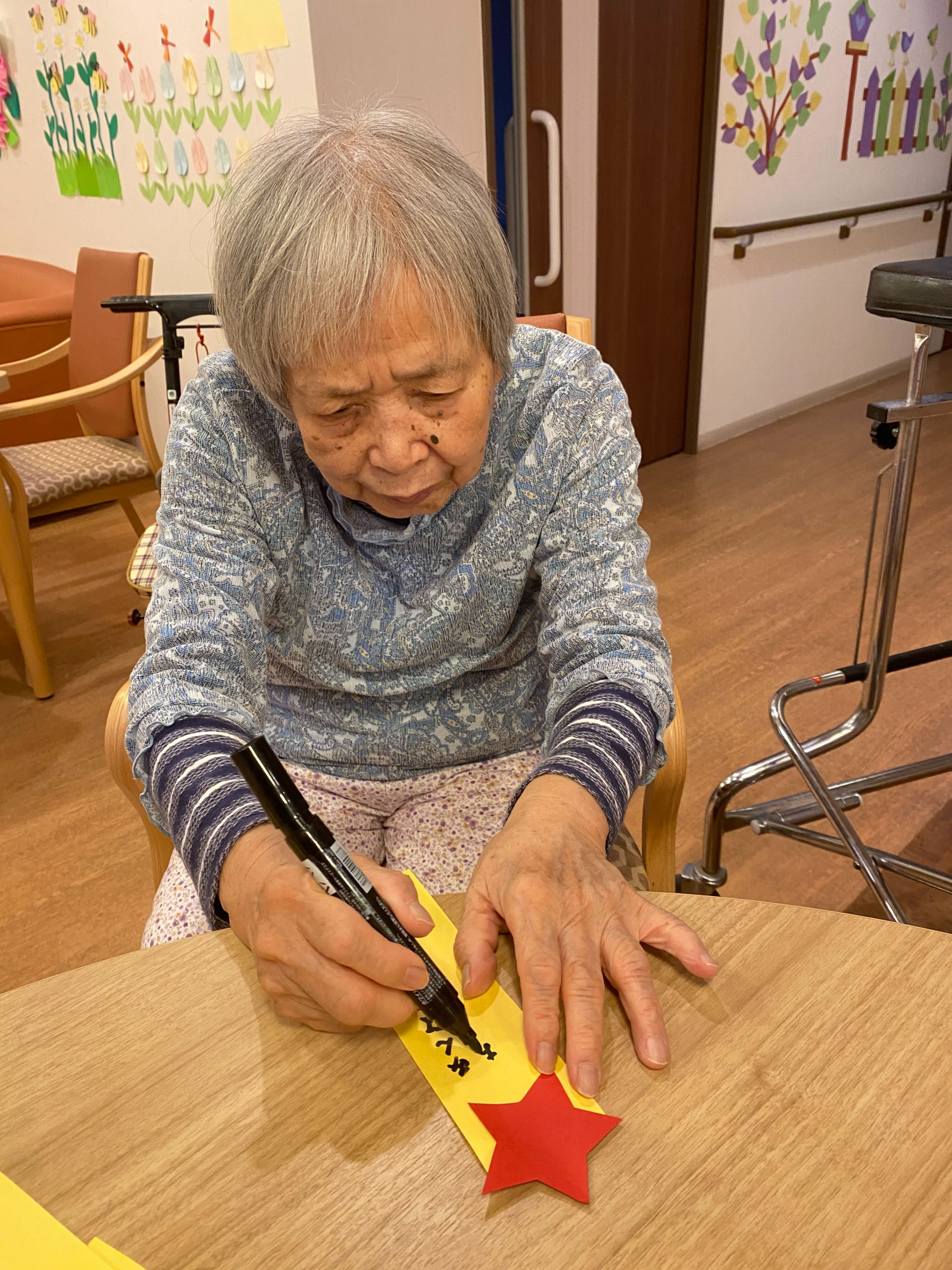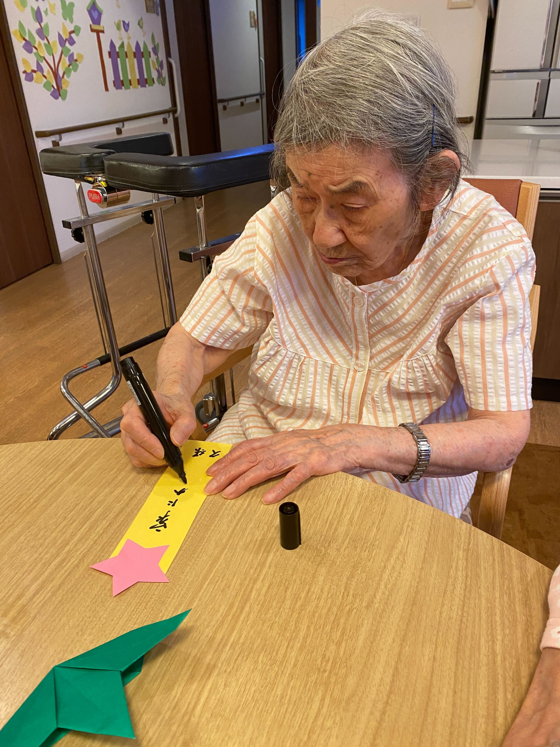 ある日、寝る準備が終わって、皆様にこれから七夕祭りですよ、何かお願い事を書いてくれませんかと尋ねると「ええ?なんだろう?」「急にそういうふうに言われたら、わからないのよ」と笑顔で仰ってました。