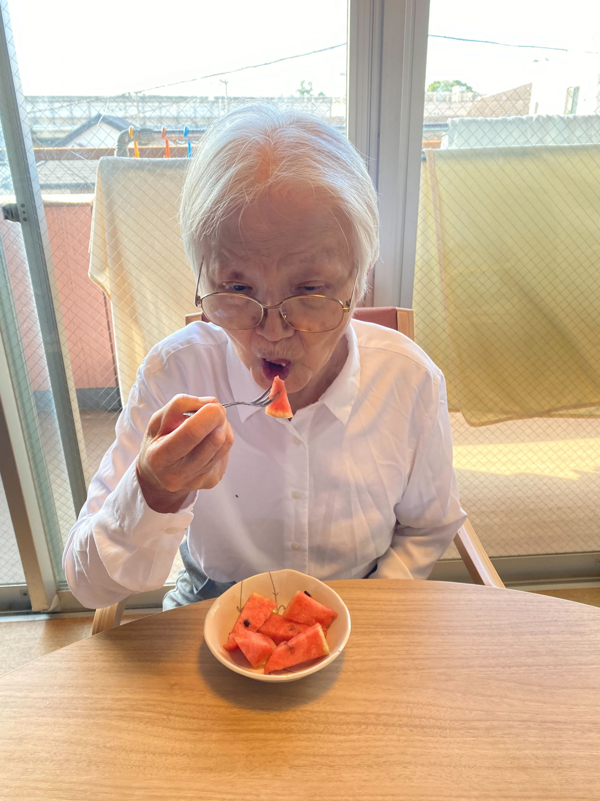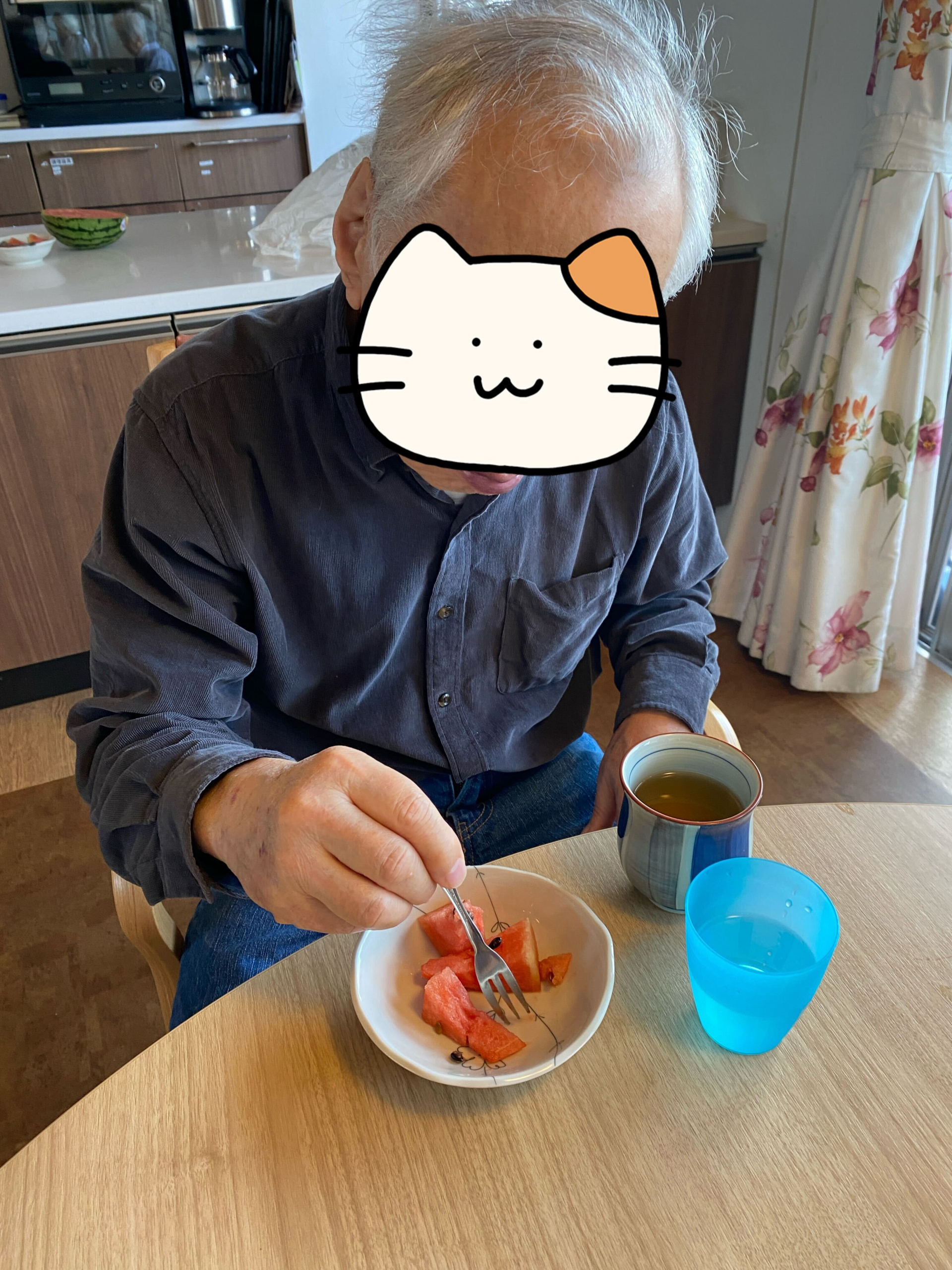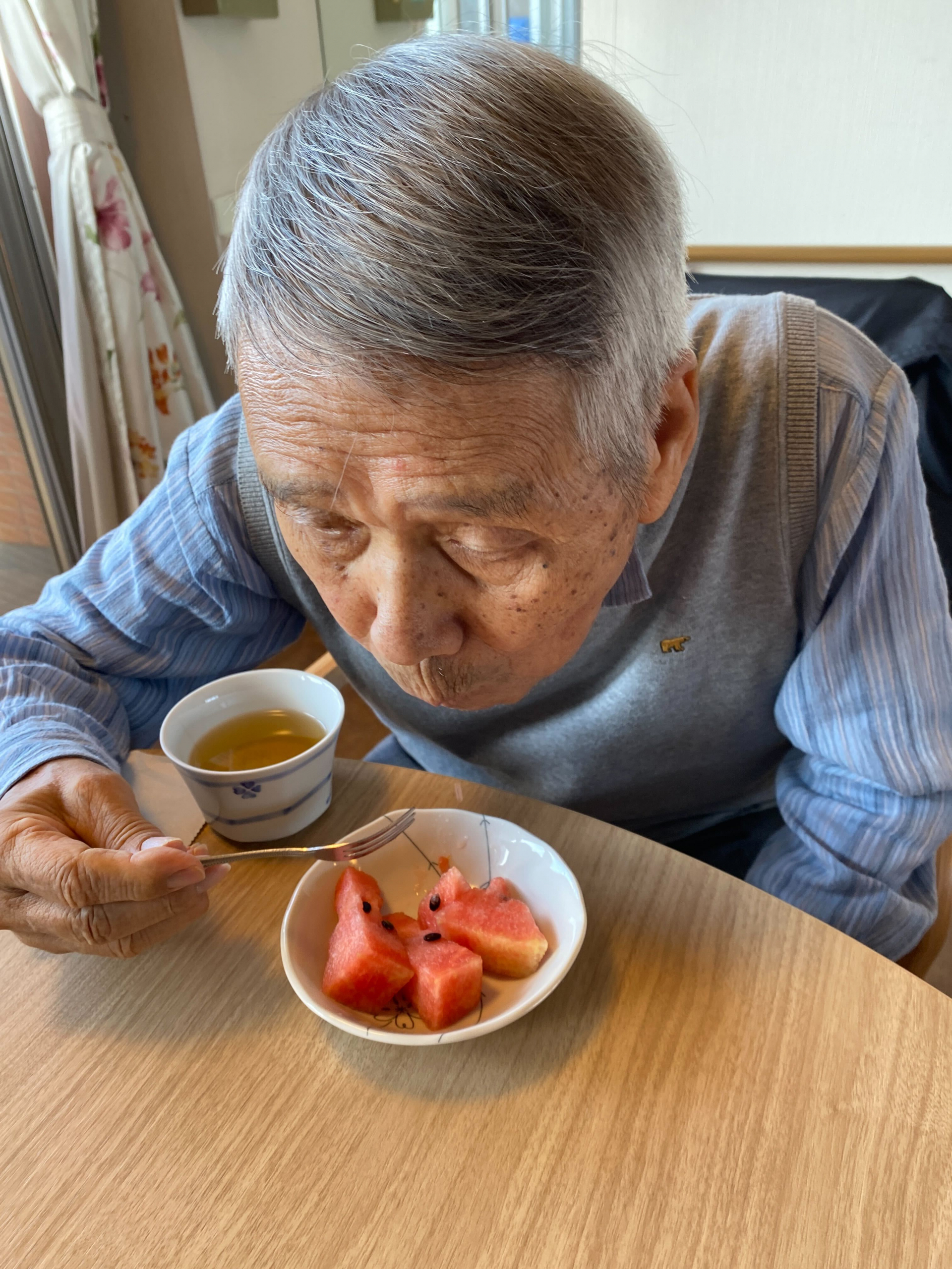 ある日、ご家族より差し入れのスイカを頂きました。体を冷やす動きあり、90%以上が水分なので、真夏の水分補給にスイカは水分豊富な夏の風物ですね。