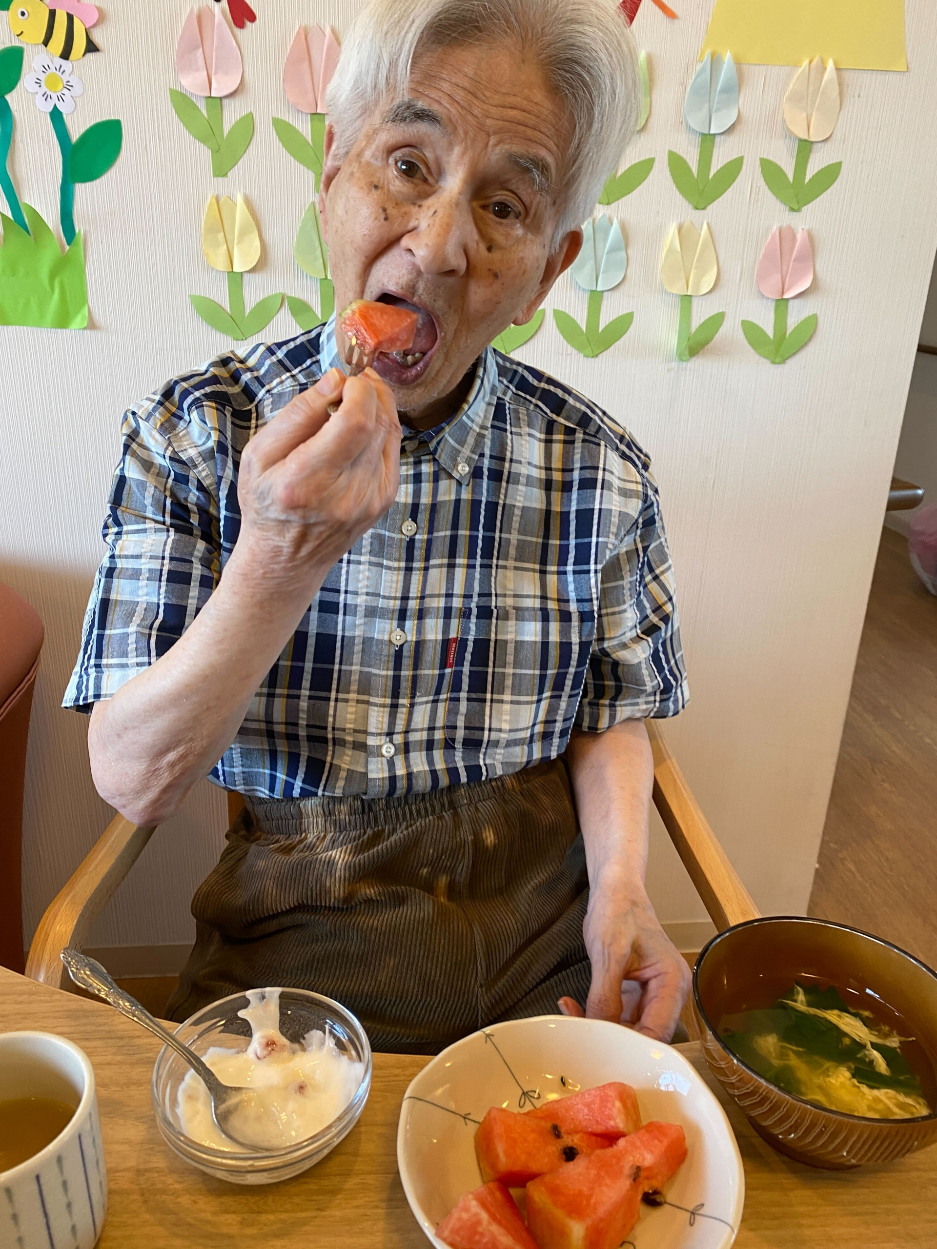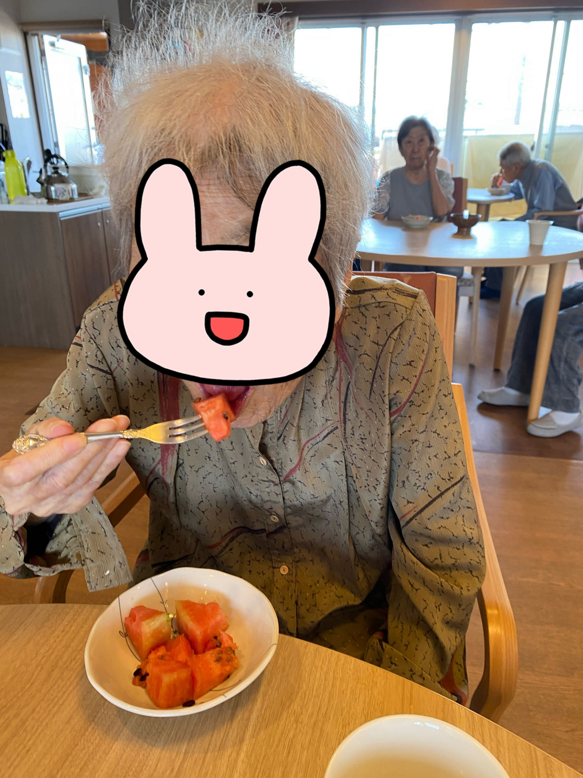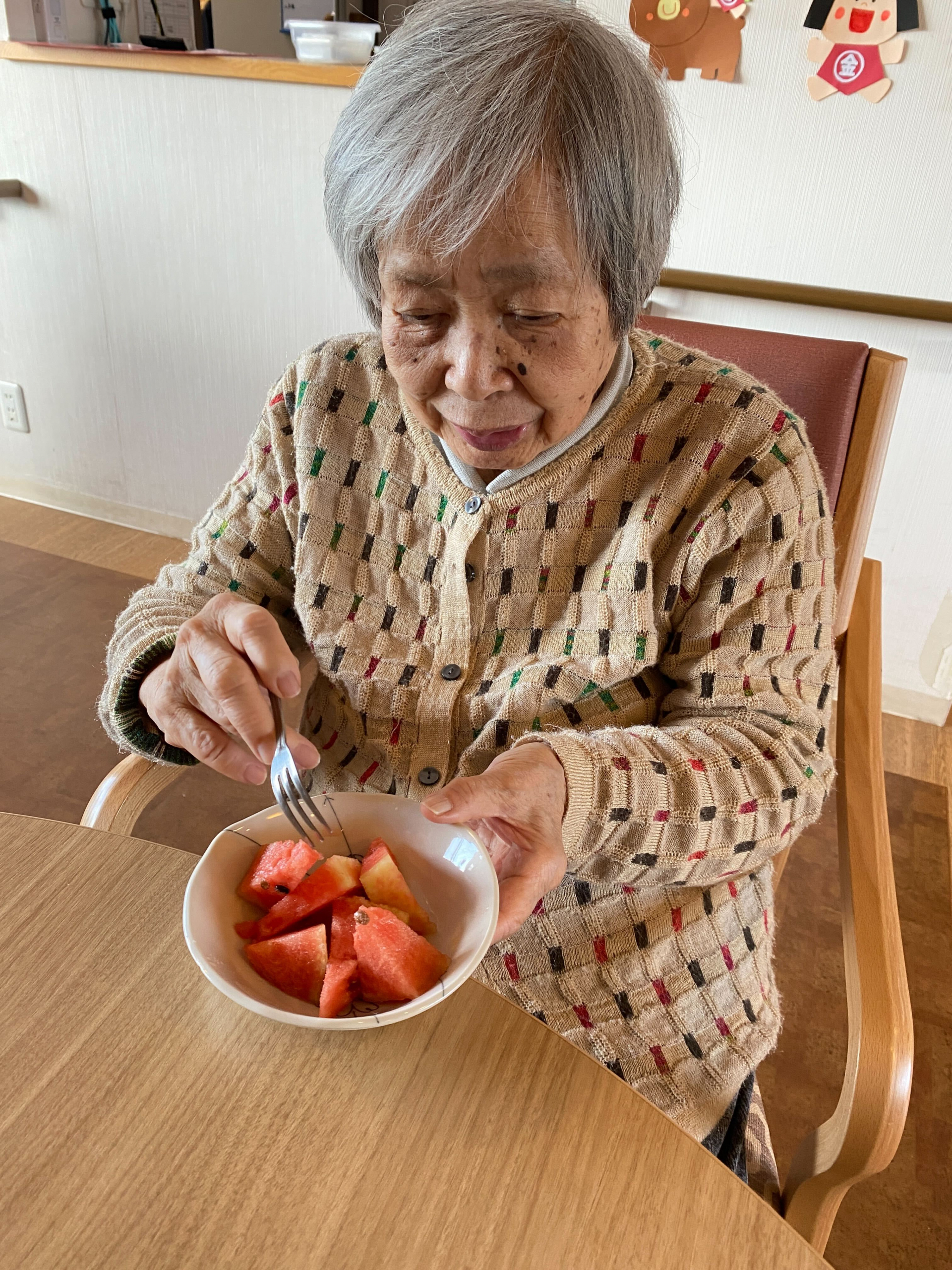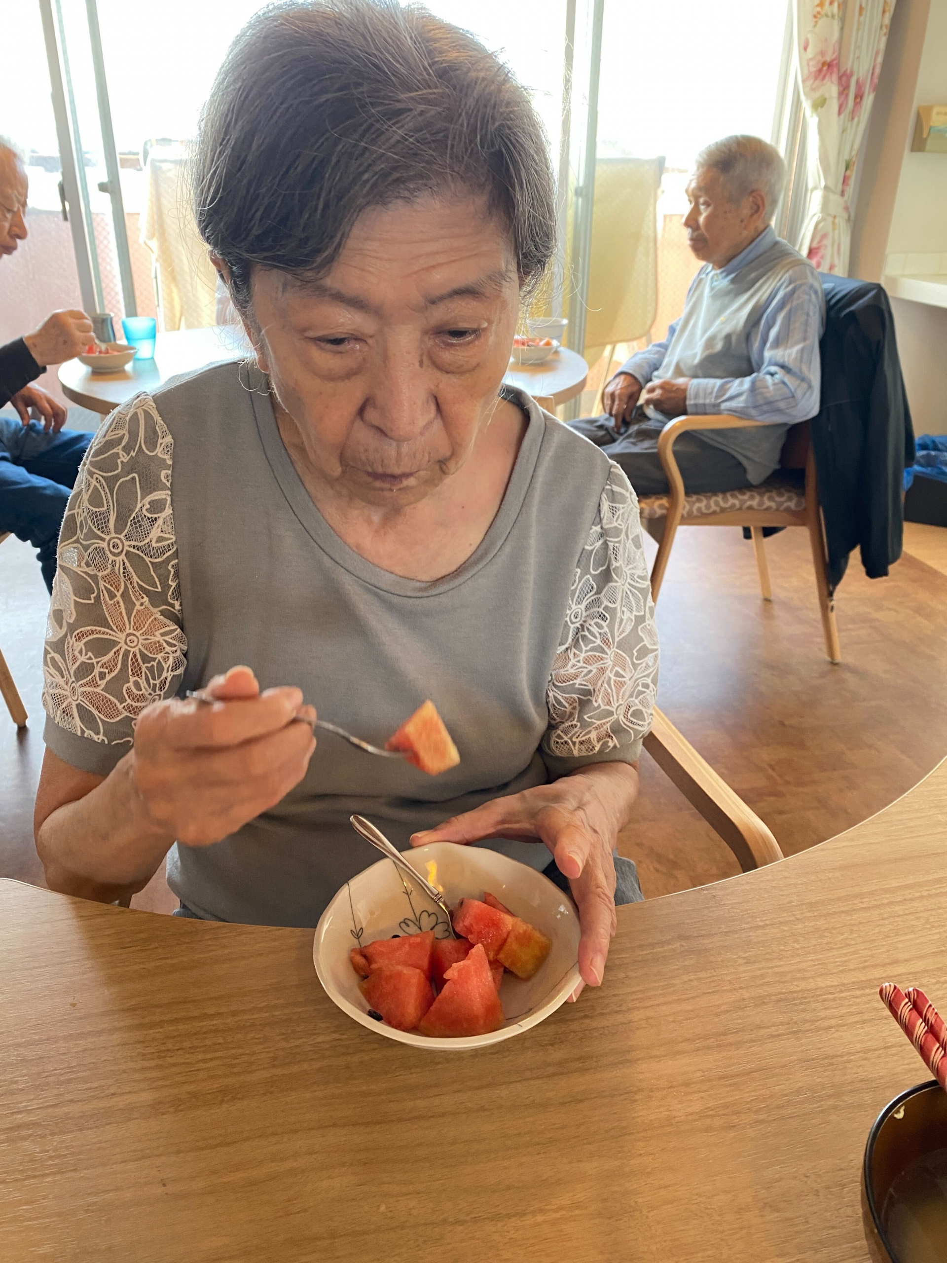 ある日、ご家族より差し入れのスイカを頂きました。体を冷やす動きあり、90%以上が水分なので、真夏の水分補給にスイカは水分豊富な夏の風物ですね。