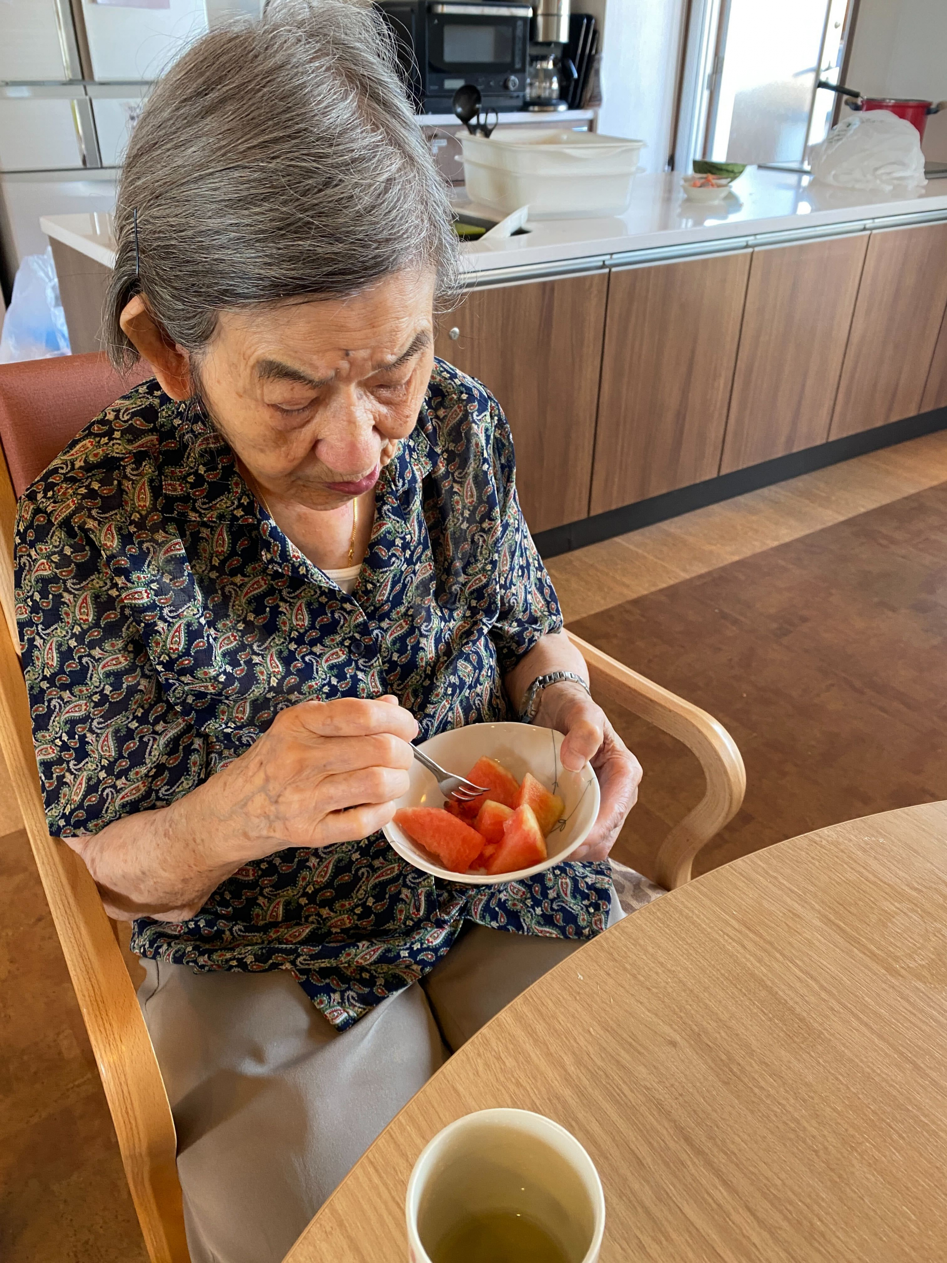 K様に「娘さんから差し入のスイカ頂きましたよ」とお伝えすると「あらま、そう~みんなと一緒に食べましょう」と丁寧に仰ってました。