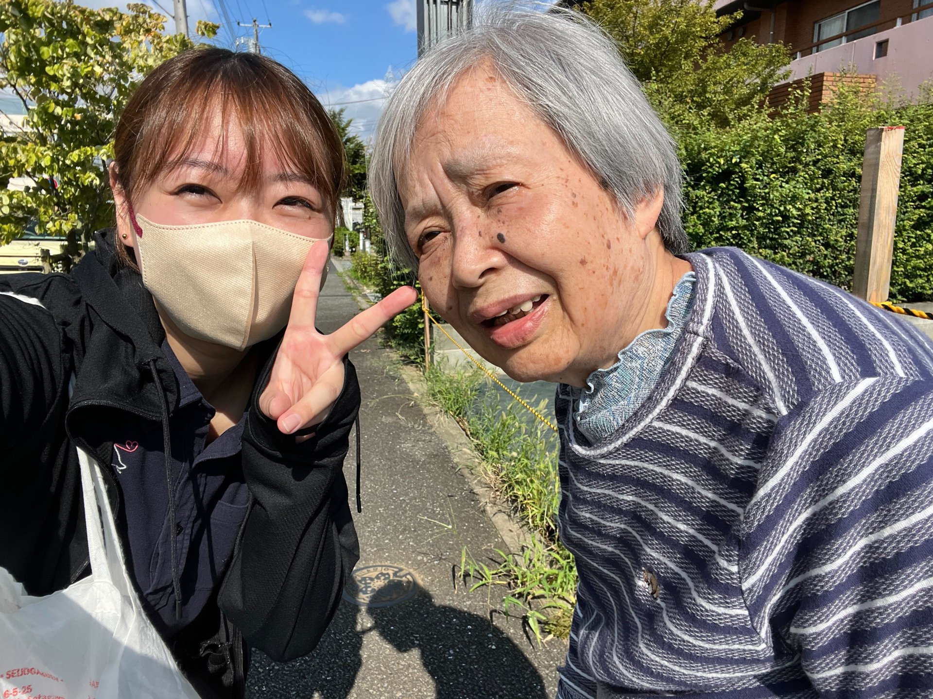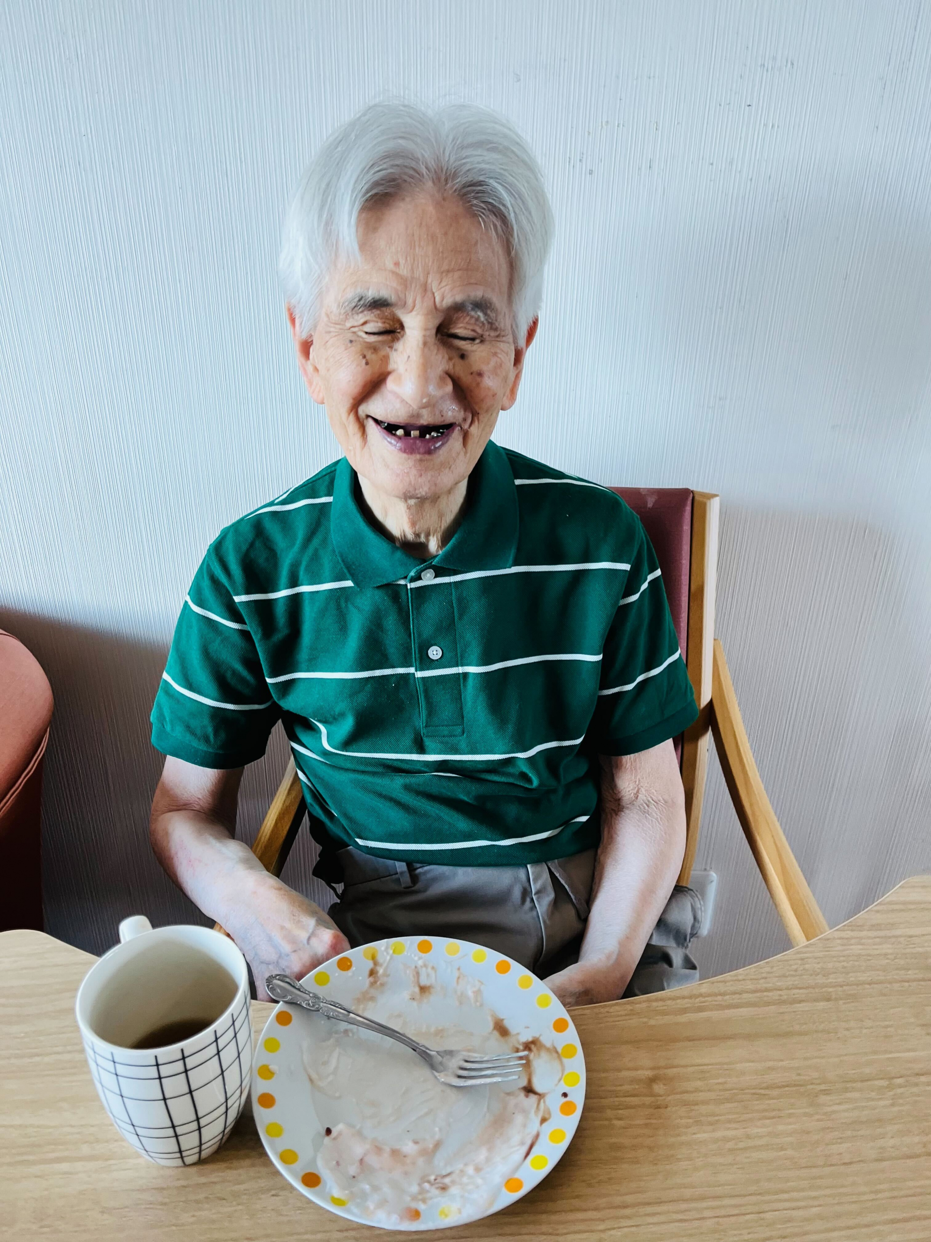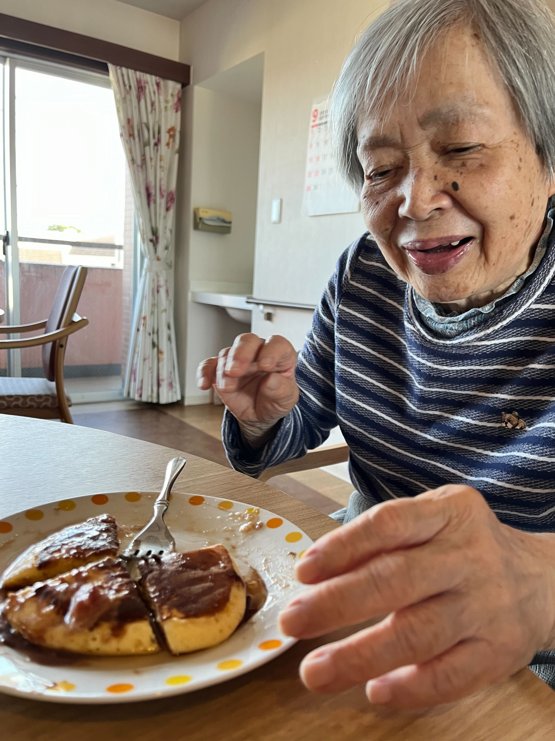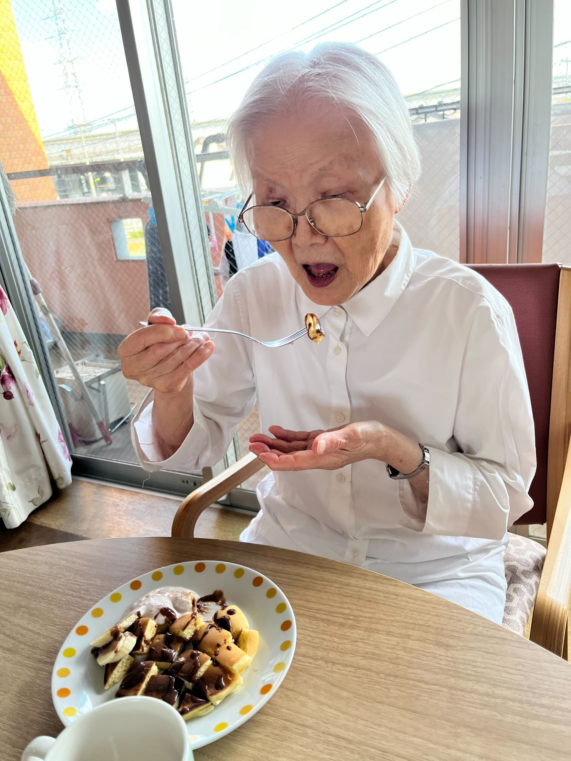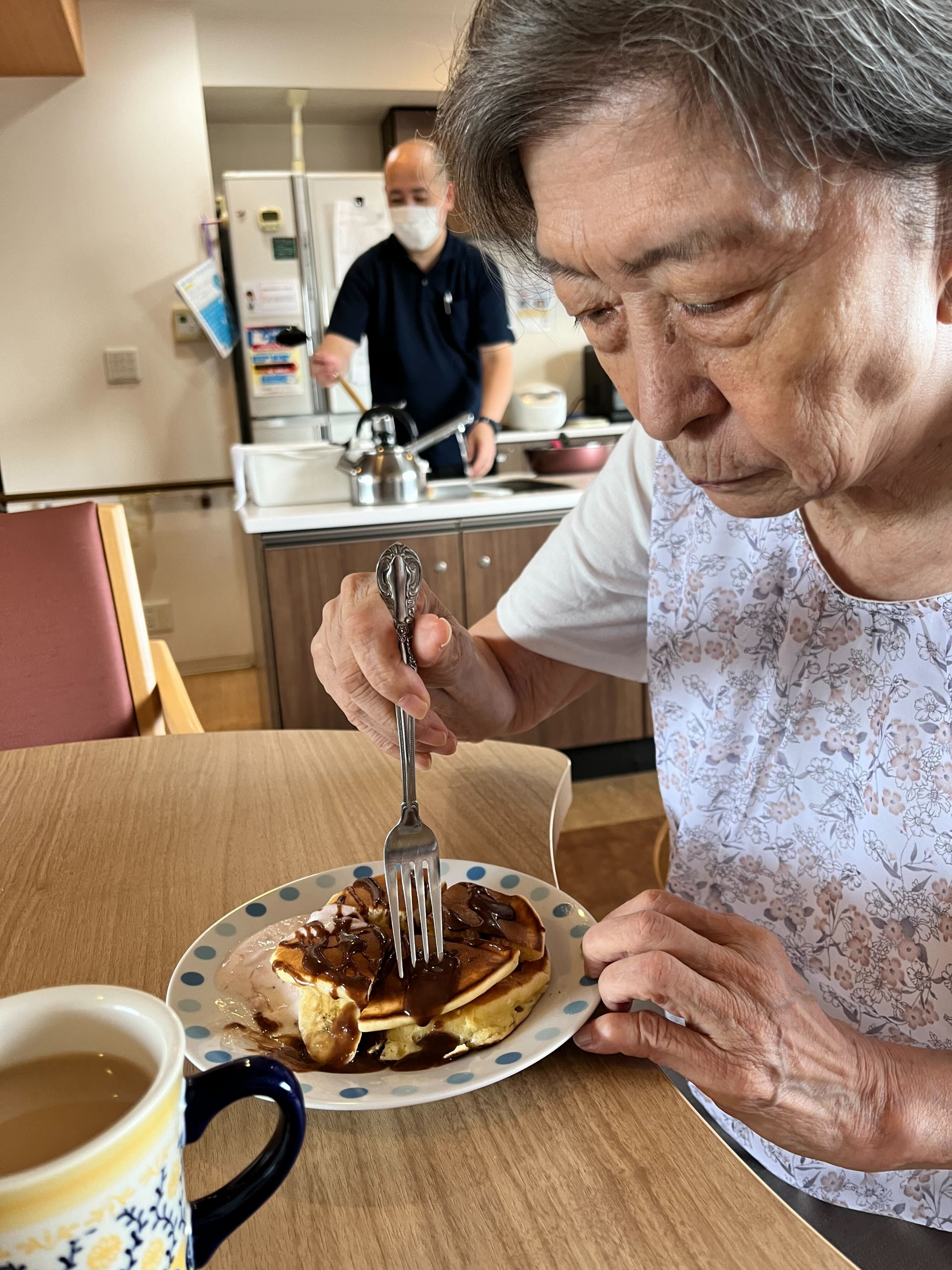 施設に帰り、職員がホットケーキを焼いていると、「いい匂いだ、早く食べたいね」と皆さん完成が待ち遠しい様子。